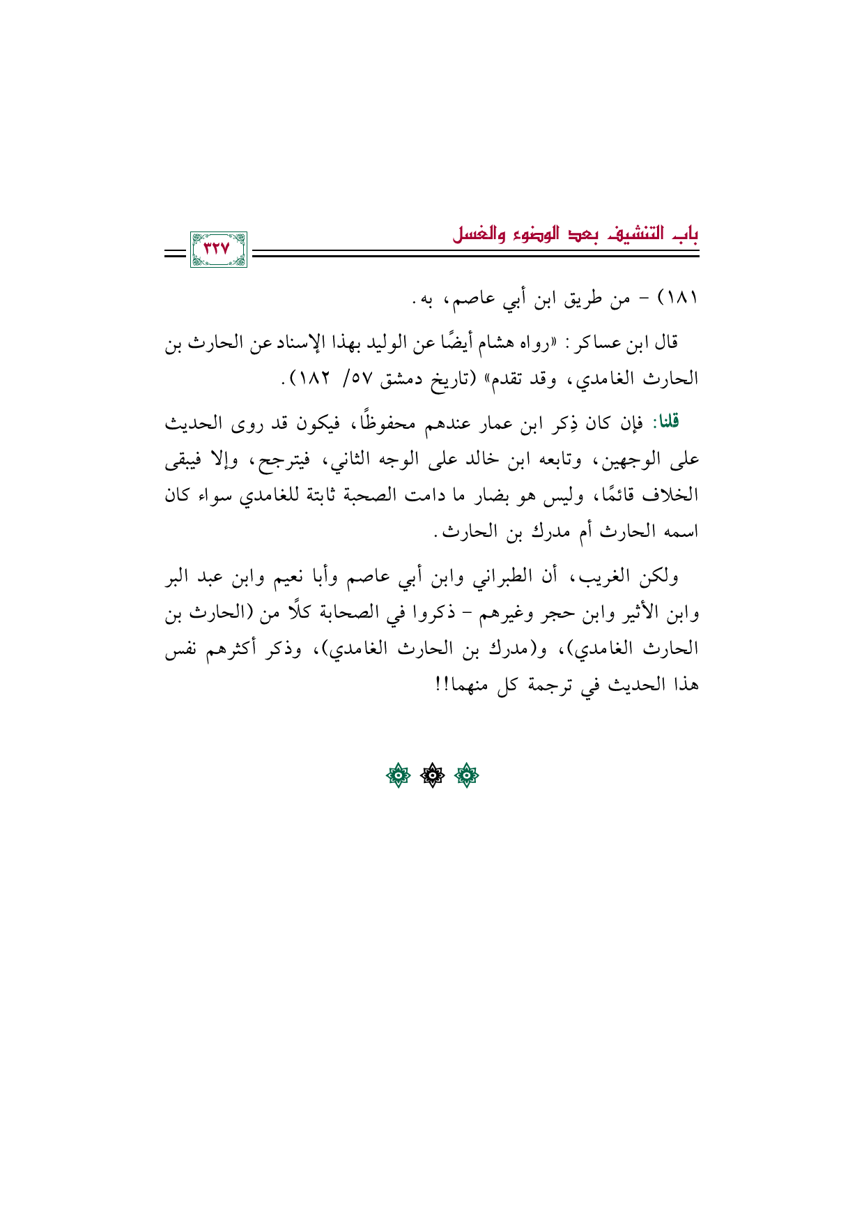 قلنا: فإن كان ذِكر ابن عمار عندهم محفوظًا، فيكون قد روى الحديث على الوجهين، وتابعه ابن خالد على الوجه الثاني، فيترجح، وإلا فيبقى الخلاف قائمًا، وليس هو بضار ما دامت الصحبة ثابتة للغامدي سواء كان اسمه الحارث أم مدرك بن الحارث.