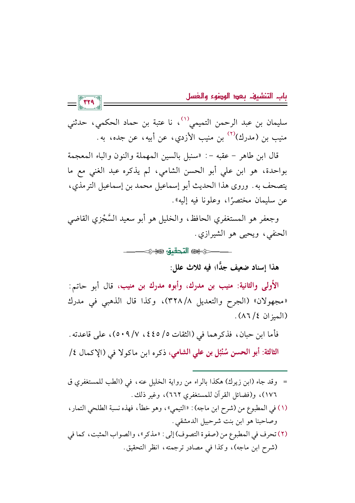 الأولى والثانية: منيب بن مدرك، وأبوه مدرك بن منيب، قال أبو حاتم: "مجهولان" (الجرح والتعديل ٨/ ٣٢٨)، وكذا قال الذهبي في مدرك (الميزان ٤/ ٨٦).