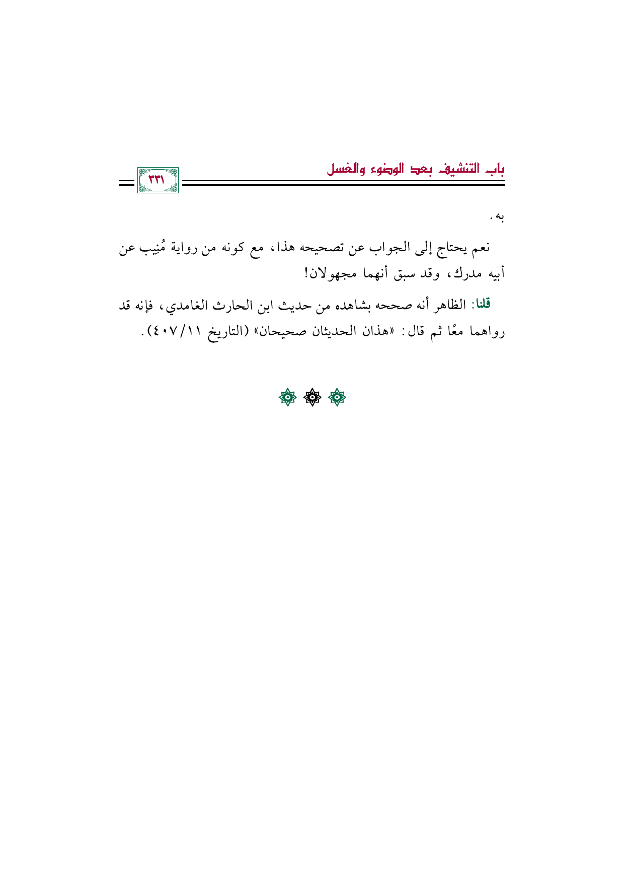 نعم يحتاج إلى الجواب عن تصحيحه هذا، مع كونه من رواية مُنِيب عن أبيه مدرك، وقد سبق أنهما مجهولان!