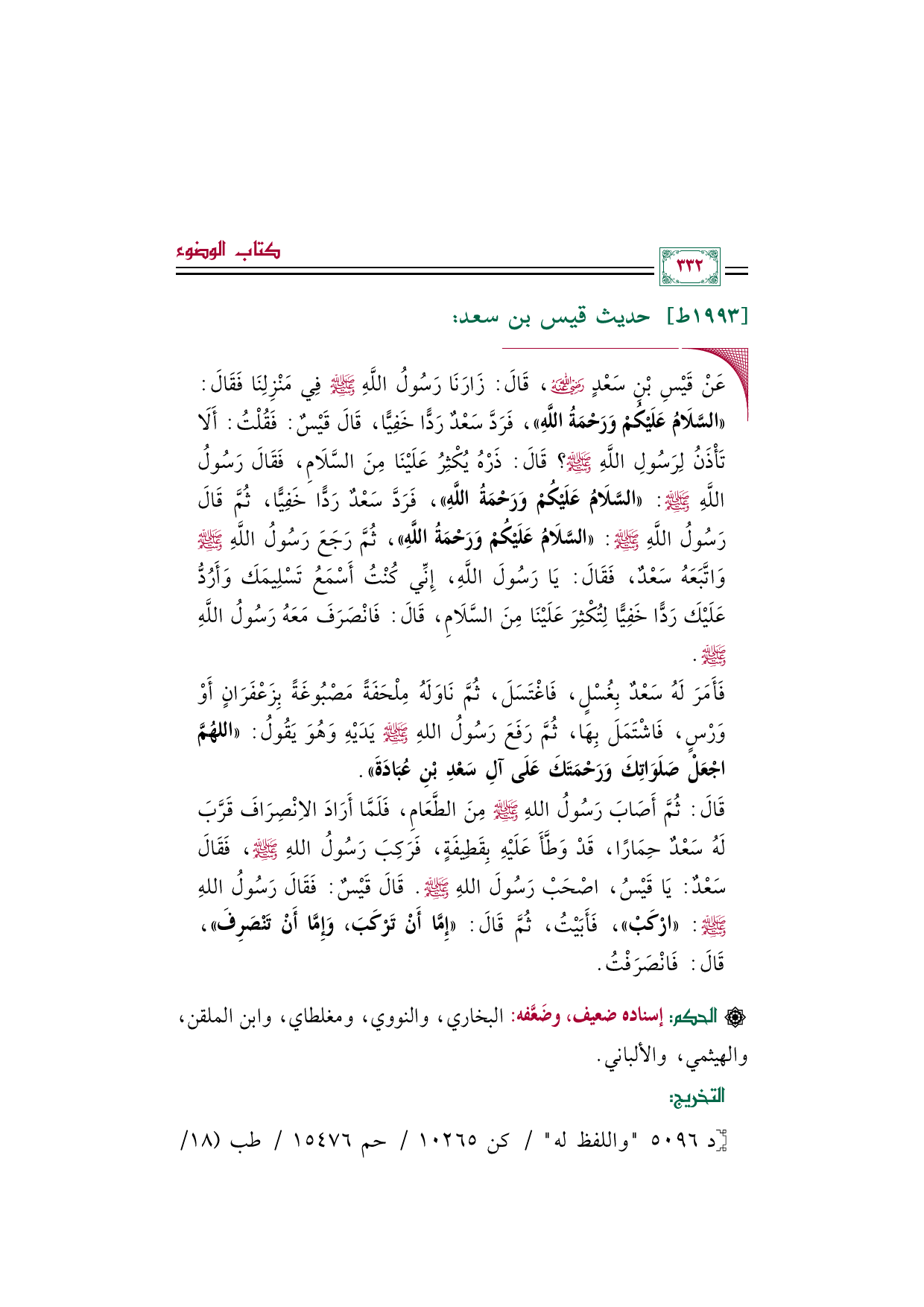 ◼ عَنْ قَيْسِ بْنِ سَعْدٍ رَضِيَ اللهُ عَنْهُ، قَالَ: زَارَنَا رَسُولُ اللَّهِ صَلَّى اللهُ عَلَيْهِ وَسَلَّمَ فِي مَنْزِلِنَا فَقَالَ: «السَّلَامُ عَلَيْكُمْ وَرَحْمَةُ اللَّهِ»، فَرَدَّ سَعْدٌ رَدًّا خَفِيًّا، قَالَ قَيْسٌ: فَقُلْتُ: أَلَا تَأْذَنُ لِرَسُولِ اللَّهِ صَلَّى اللهُ عَلَيْهِ وَسَلَّمَ؟ قَالَ: ذَرْهُ يُكْثِرُ عَلَيْنَا مِنَ السَّلَامِ، فَقَالَ رَسُولُ اللَّهِ صَلَّى اللهُ عَلَيْهِ وَسَلَّمَ: «السَّلَامُ عَلَيْكُمْ وَرَحْمَةُ اللَّهِ»، فَرَدَّ سَعْدٌ رَدًّا خَفِيًّا، ثُمَّ قَالَ رَسُولُ اللَّهِ صَلَّى اللهُ عَلَيْهِ وَسَلَّمَ: «السَّلَامُ عَلَيْكُمْ وَرَحْمَةُ اللَّهِ»، ثُمَّ رَجَعَ رَسُولُ اللَّهِ صَلَّى اللهُ عَلَيْهِ وَسَلَّمَ وَاتَّبَعَهُ سَعْدٌ، فَقَالَ: يَا رَسُولَ اللَّهِ، إِنِّي كُنْتُ أَسْمَعُ تَسْلِيمَكَ وَأَرُدُّ عَلَيْكَ رَدًّا خَفِيًّا لِتُكْثِرَ عَلَيْنَا مِنَ السَّلَامِ، قَالَ: فَانْصَرَفَ مَعَهُ رَسُولُ اللَّهِ صَلَّى اللهُ عَلَيْهِ وَسَلَّمَ.