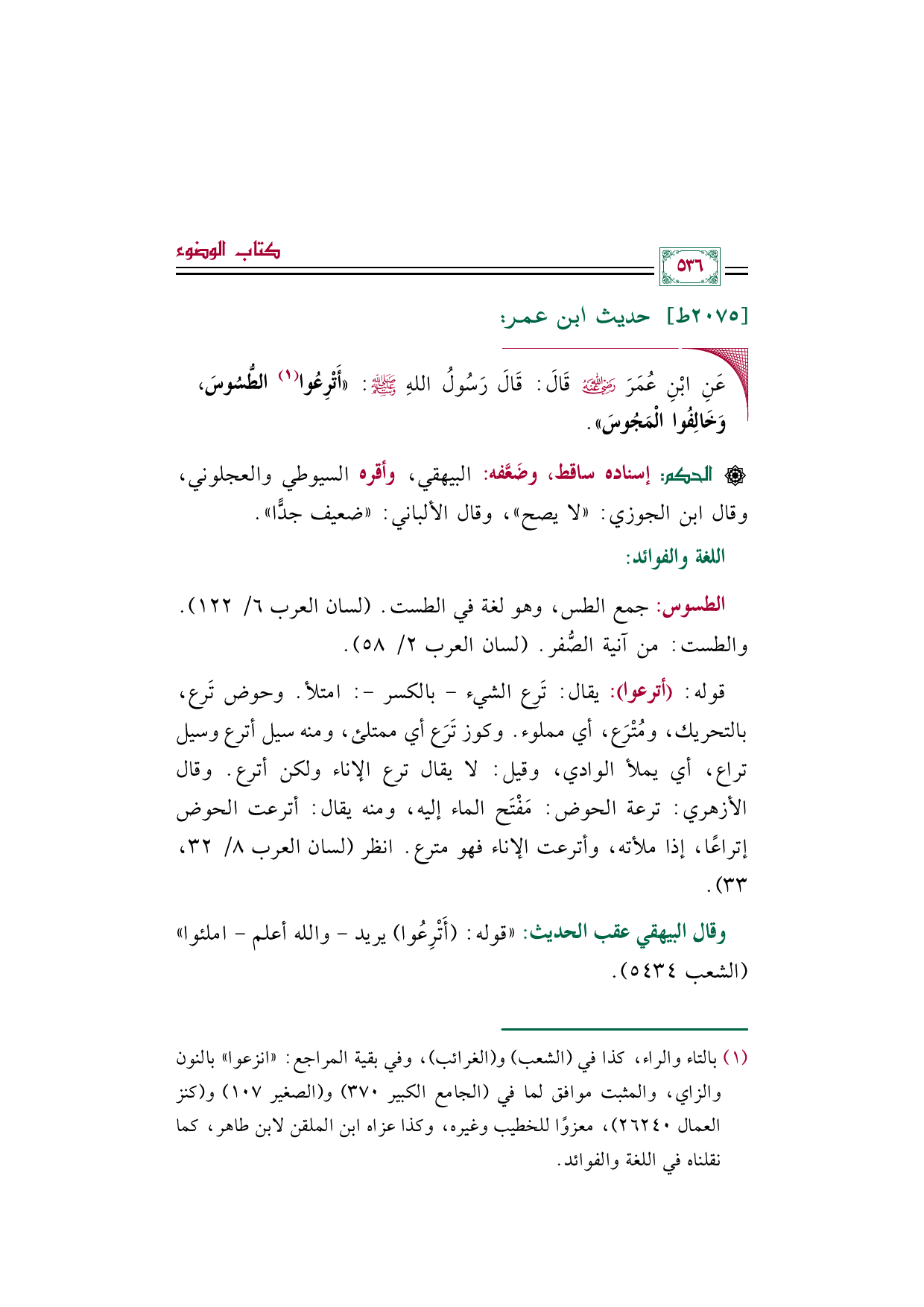 (¬١) - بالتاء والراء، كذا في (الشعب) و (الغرائب)، وفي بقية المراجع: "انزعوا" بالنون والزاي، والمثبت موافق لما في (الجامع الكبير ٣٧٠) و (الصغير ١٠٧) و (كنز العمال ٢٦٢٤٠)، معزوًا للخطيب وغيره، وكذا عزاه ابن الملقن لابن طاهر، كما نقلناه في اللغة والفوائد.