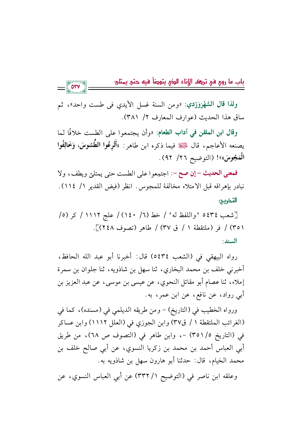 وقال ابن الملقن في آداب الطعام: "وأن يجتمعوا على الطست خلافًا لما يصنعه الأعاجم، قال عليه السلام فيما ذكره ابن طاهر: ((أَتْرِعُوا الطُّسُوسَ، وَخَالِفُوا الْمَجُوسَ)) "! (التوضيح ٢٦/ ٩٢).