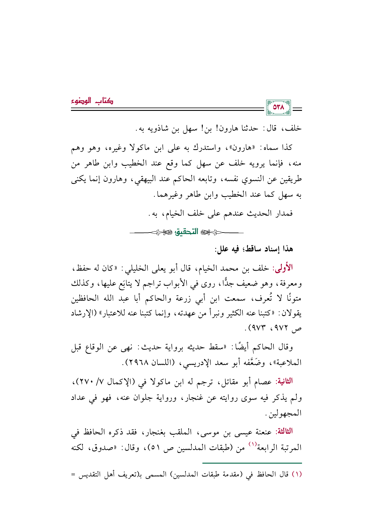 كذا سماه: "هارون"، واستدرك به على ابن ماكولا وغيره، وهو وهم منه، فإنما يرويه خلف عن سهل كما وقع عند الخطيب وابن طاهر من طريقين عن النسوي نفسه، وتابعه الحاكم عند البيهقي، وهارون إنما يكنى به سهل كما عند الخطيب وابن طاهر وغيرهما.