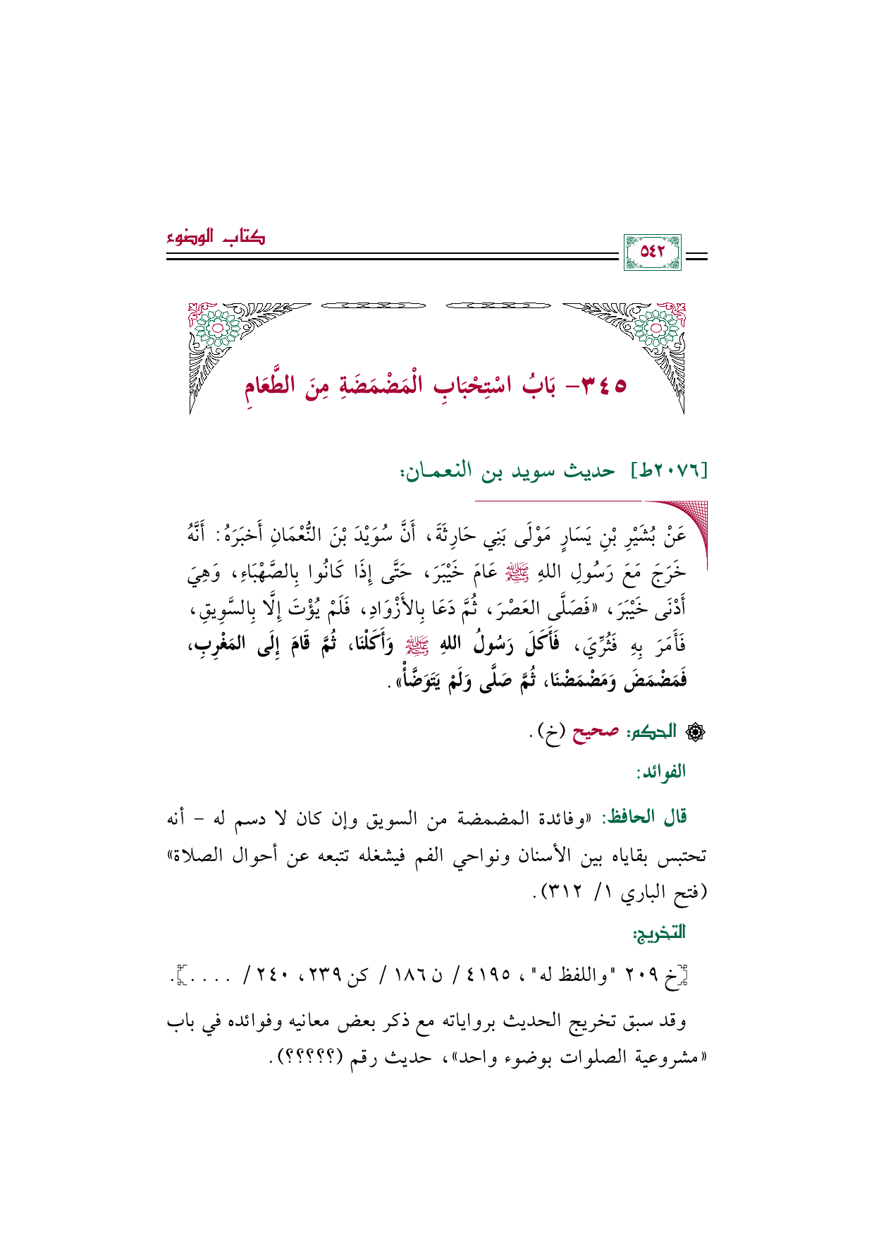 وقد سبق تخريج الحديث برواياته مع ذكر بعض معانيه وفوائده في باب "مشروعية الصلوات بوضوء واحد"، حديث رقم (؟ ؟ ؟ ؟ ؟ ).