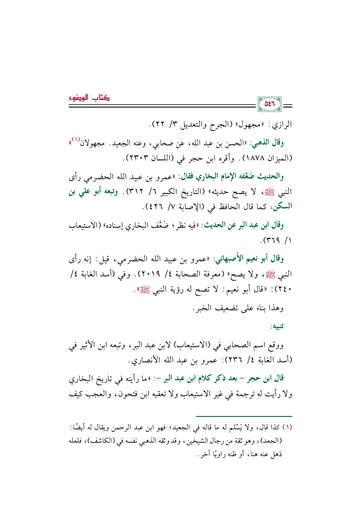 وقال أبو نعيم الأصبهاني: "عمرو بن عبيد الله الحضرمي، قيل: إنه رأى النبي صلى الله عليه وسلم، ولا يصح" (معرفة الصحابة ٤/ ٢٠١٩). وفي (أسد الغابة ٤/ ٢٤٠): "قال أبو نعيم: لا تصح له رؤية النبي صلى الله عليه وسلم".