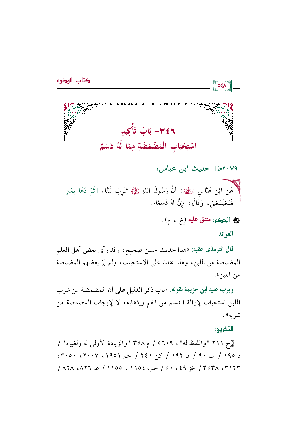 قال الترمذي عقبه: "هذا حديث حسن صحيح، وقد رأى بعض أهل العلم المضمضة من اللبن، وهذا عندنا على الاستحباب، ولم يَرَ بعضهم المضمضة من اللبن".