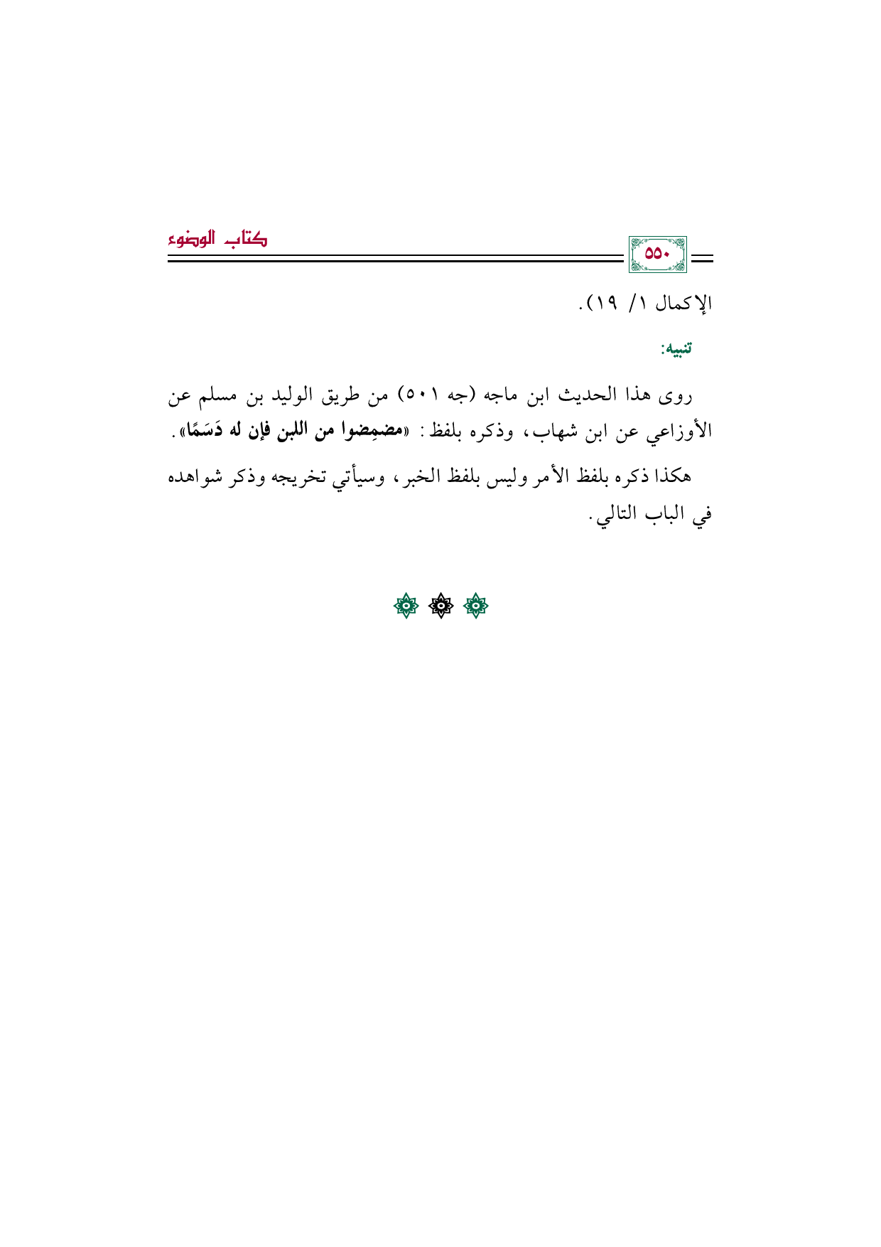 روى هذا الحديث ابن ماجه (جه ٥٠١) من طريق الوليد بن مسلم عن الأوزاعي عن ابن شهاب، وذكره بلفظ: ((مضمِضوا من اللبن فإن له دَسَمًا)).