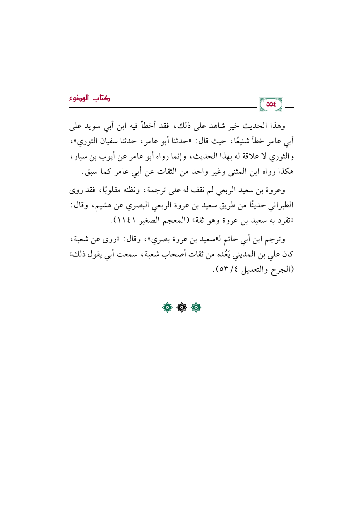 وعروة بن سعيد الربعي لم نقف له على ترجمة، ونظنه مقلوبًا، فقد روى الطبراني حديثًا من طريق سعيد بن عروة الربعي البصري عن هشيم، وقال: "تفرد به سعيد بن عروة وهو ثقة" (المعجم الصغير ١١٤١).