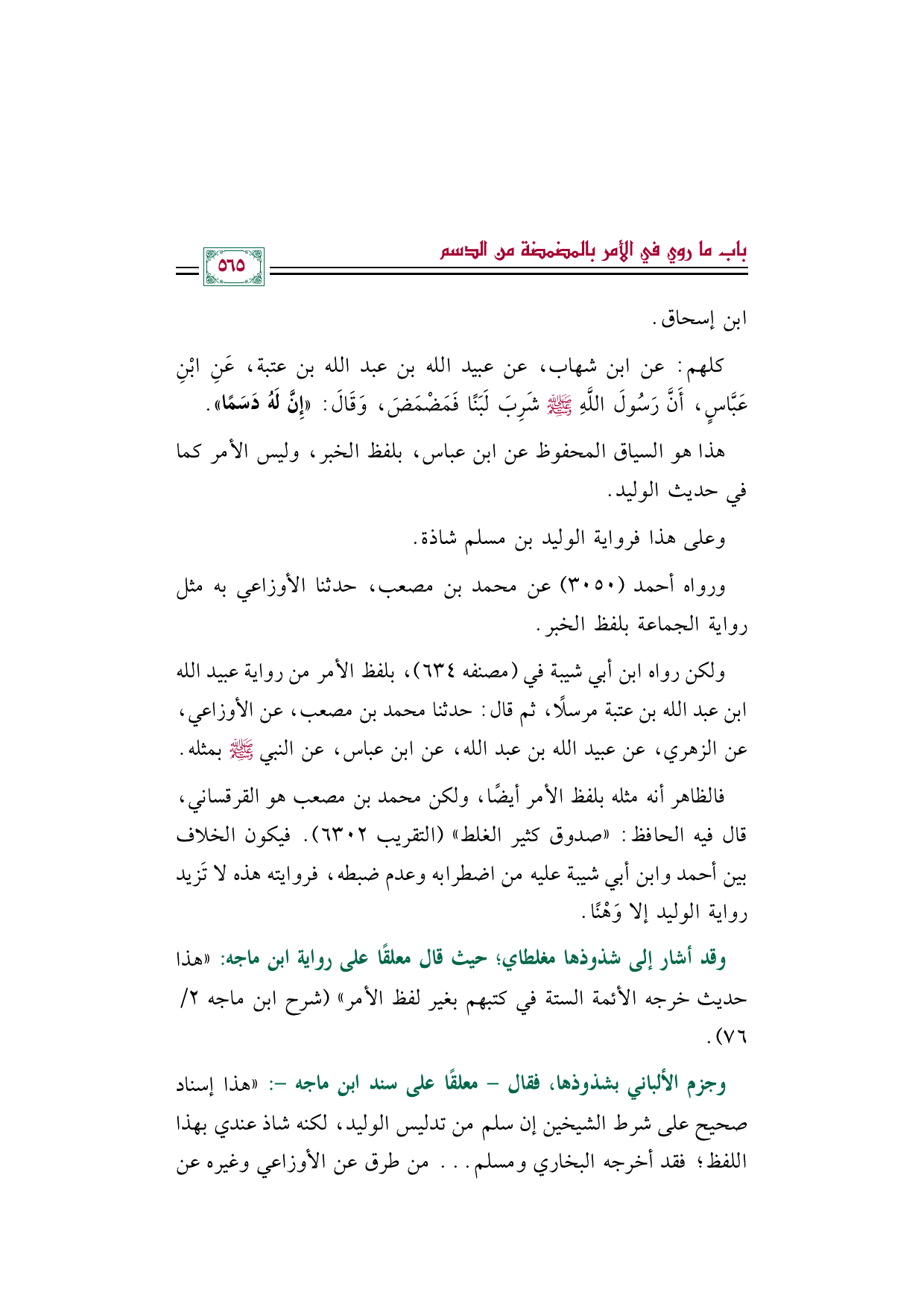كلهم: عن ابن شهاب، عن عبيد الله بن عبد الله بن عتبة، عَنِ ابْنِ عَبَّاسٍ، أَنَّ رَسُولَ اللَّهِ صَلَّى اللهُ عَلَيْهِ وَسَلَّمَ شَرِبَ لَبَنًا فَمَضْمَضَ، وَقَالَ: «إِنَّ لَهُ دَسَمًا».
