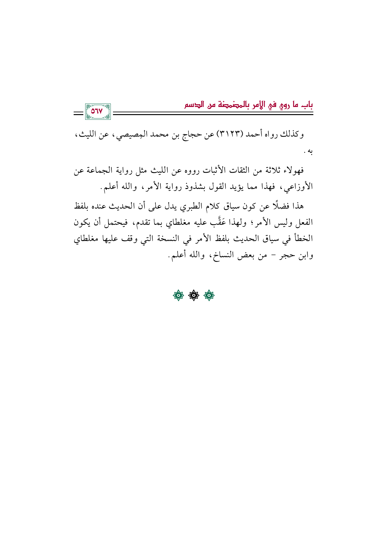 هذا فضلًا عن كون سياق كلام الطبري يدل على أن الحديث عنده بلفظ الفعل وليس الأمر؛ ولهذا عَقَّب عليه مغلطاي بما تقدم، فيحتمل أن يكون الخطأ في سياق الحديث بلفظ الأمر في النسخة التي وقف عليها مغلطاي وابن حجر - من بعض النساخ، والله أعلم.