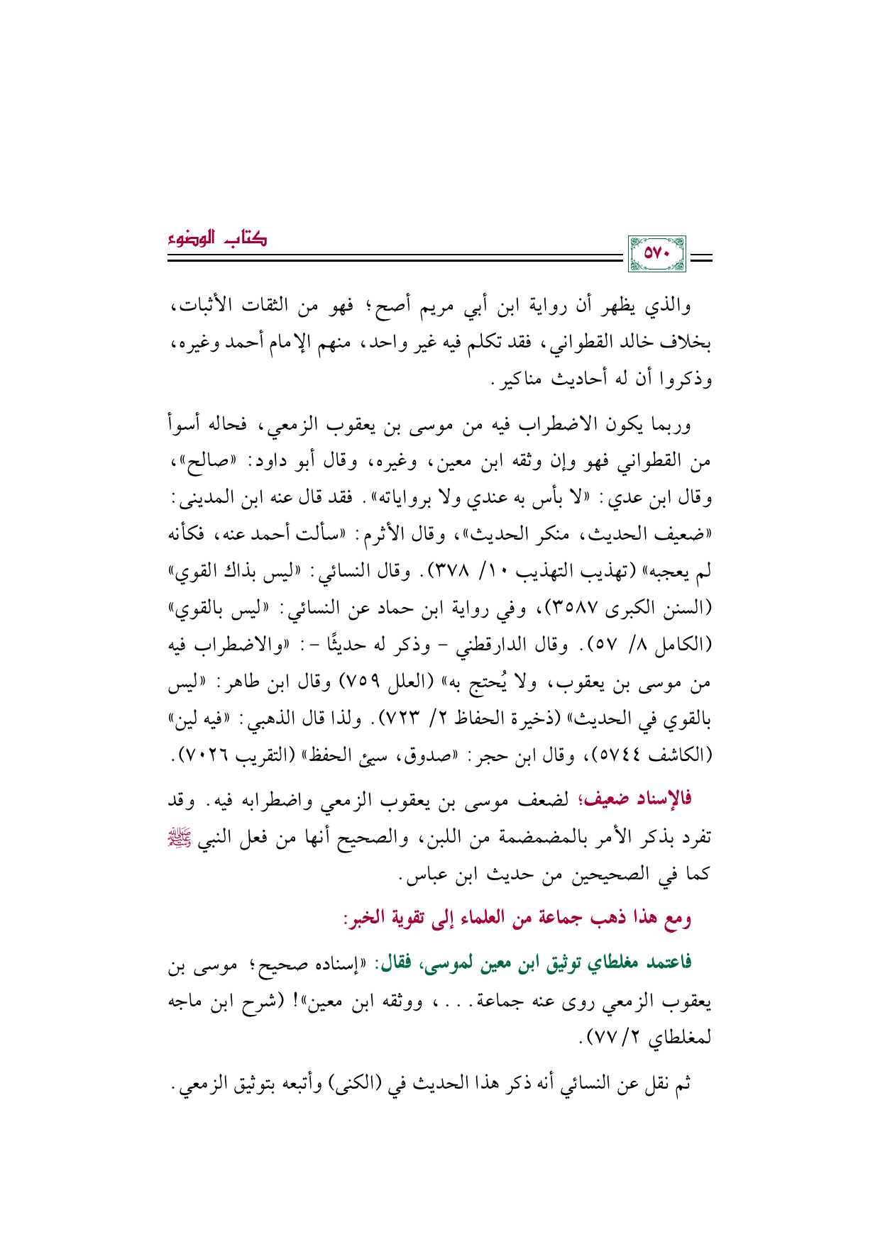 فاعتمد مغلطاي توثيق ابن معين لموسى، فقال: "إسناده صحيح؛ موسى بن يعقوب الزمعي روى عنه جماعة ... ، ووثقه ابن معين"! (شرح ابن ماجه لمغلطاي ٢/ ٧٧).