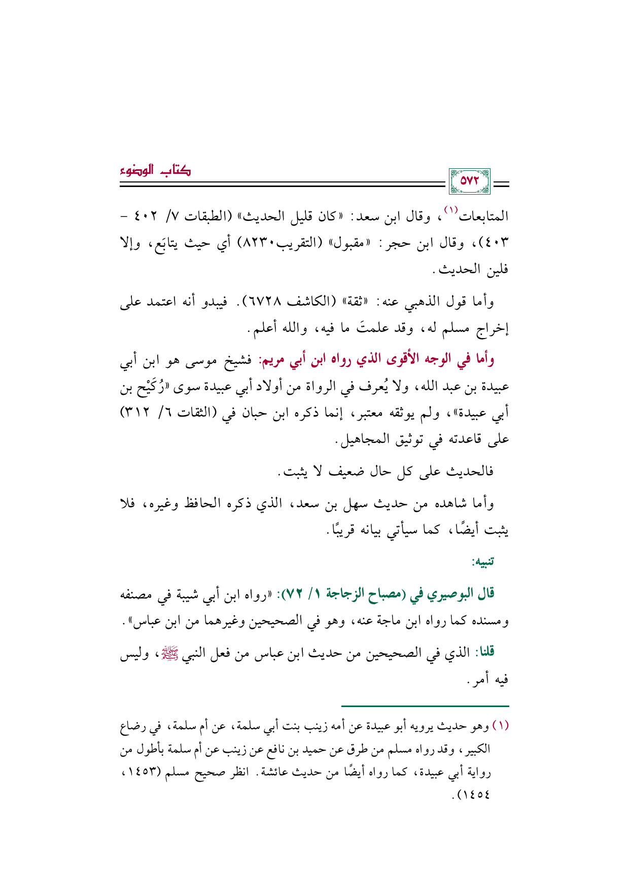 وأما في الوجه الأقوى الذي رواه ابن أبي مريم: فشيخ موسى هو ابن أبي عبيدة بن عبد الله، ولا يُعرف في الرواة من أولاد أبي عبيدة سوى "رُكَيْح بن أبي عبيدة"، ولم يوثقه معتبر، إنما ذكره ابن حبان في (الثقات ٦/ ٣١٢) على قاعدته في توثيق المجاهيل.