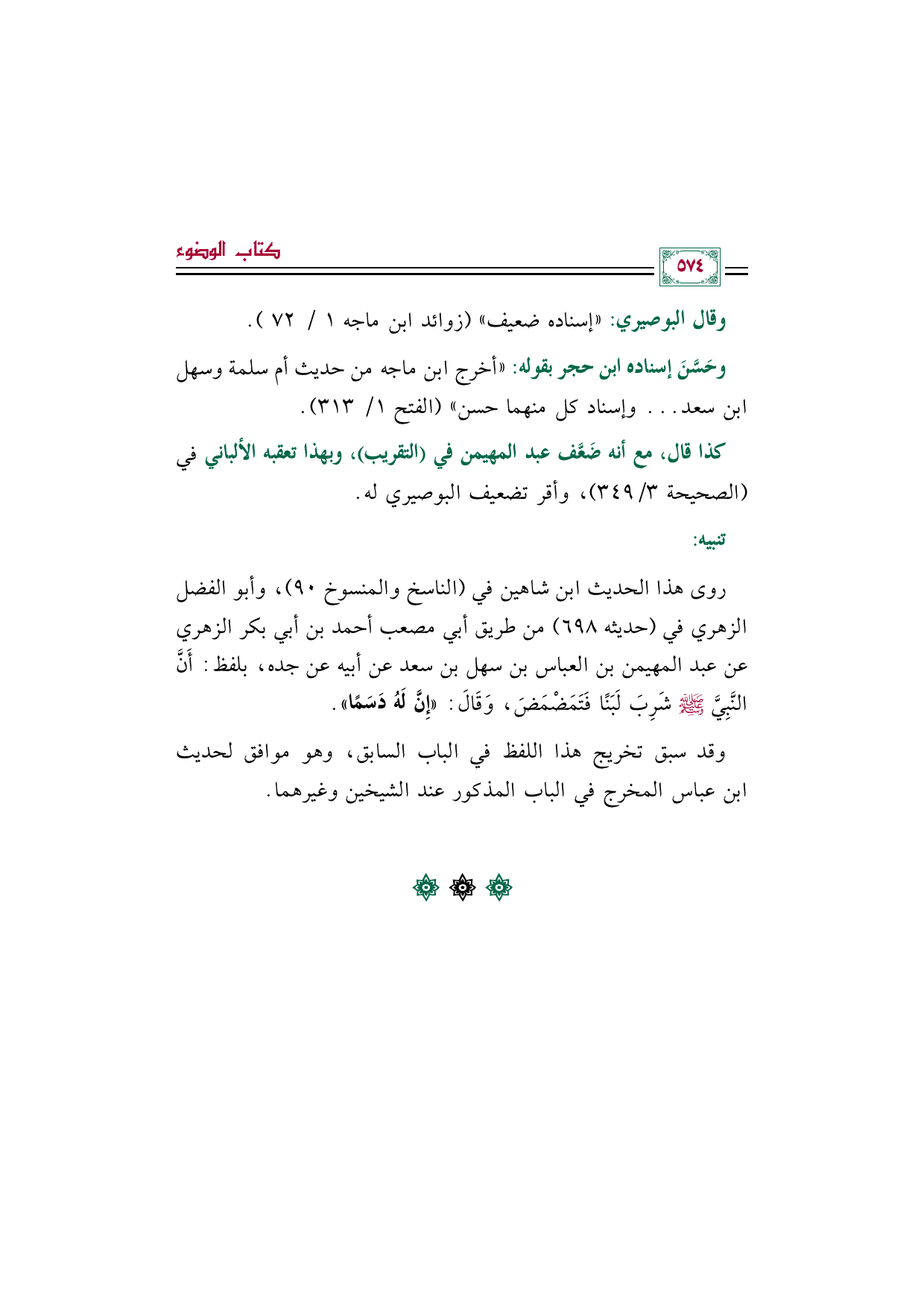روى هذا الحديث ابن شاهين في (الناسخ والمنسوخ ٩٠)، وأبو الفضل الزهري في (حديثه ٦٩٨) من طريق أبي مصعب أحمد بن أبي بكر الزهري عن عبد المهيمن بن العباس بن سهل بن سعد عن أبيه عن جده، بلفظ: أَنَّ النَّبِيَّ صَلَّى اللهُ عَلَيْهِ وَسَلَّمَ شَرِبَ لَبَنًا فَتَمَضْمَضَ، وَقَالَ: «إِنَّ لَهُ دَسَمًا».