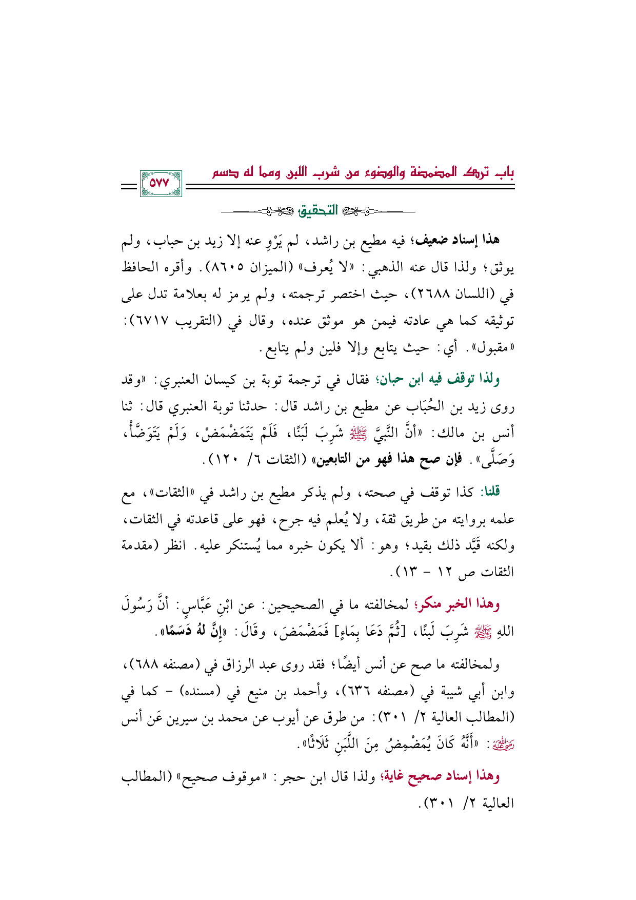 ولذا توقف فيه ابن حبان؛ فقال في ترجمة توبة بن كيسان العنبري: "وقد روى زيد بن الحُبَاب عن مطيع بن راشد قال: حدثنا توبة العنبري قال: ثنا أنس بن مالك: ((أنَّ النَّبيَّ صلى الله عليه وسلم شَرِبَ لَبَنًا، فَلَمْ يَتَمَضْمَضْ، وَلَمْ يَتَوَضَّأْ، وَصَلَّى)). فإن صح هذا فهو من التابعين" (الثقات ٦/ ١٢٠).