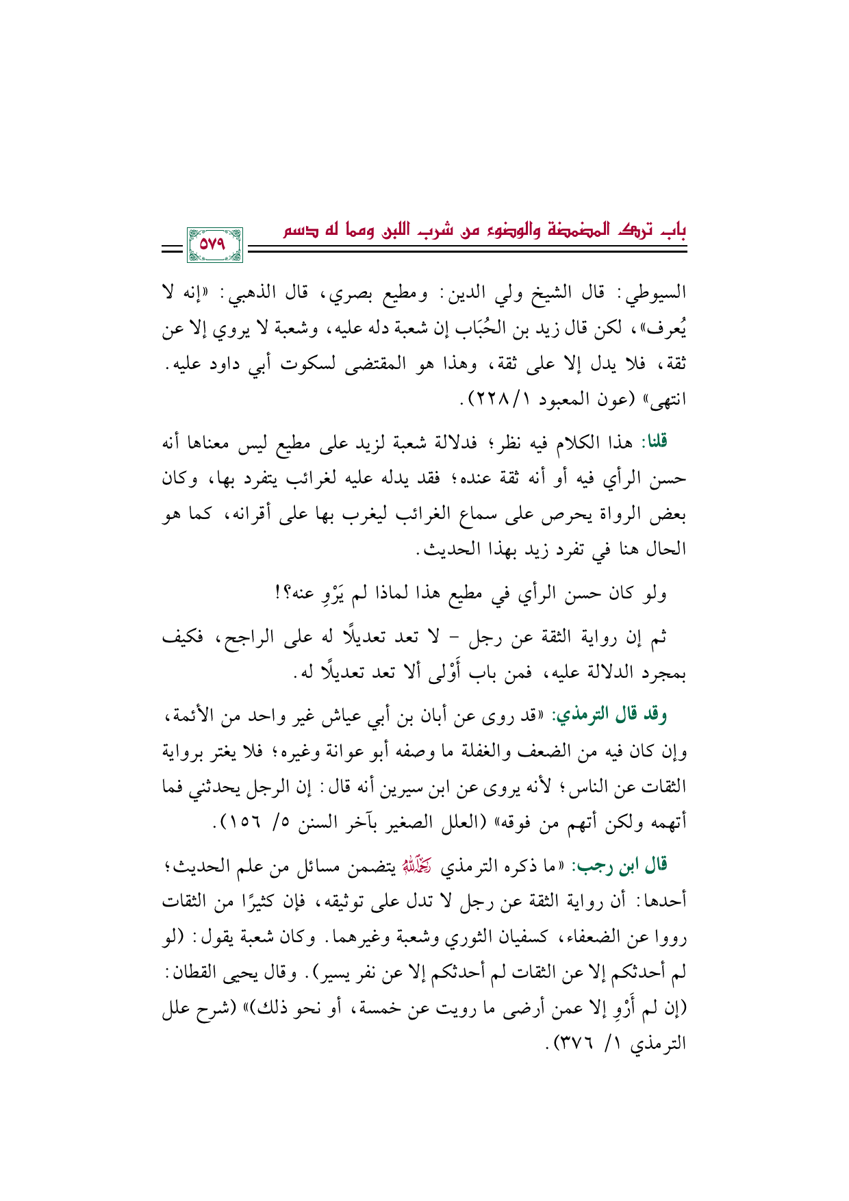 قال ابن رجب: "ما ذكره الترمذي - رحمه الله - يتضمن مسائل من علم الحديث؛ أحدها: أن رواية الثقة عن رجل لا تدل على توثيقه، فإن كثيرًا من الثقات رووا عن الضعفاء، كسفيان الثوري وشعبة وغيرهما. وكان شعبة يقول: (لو لم أحدثكم إلا عن الثقات لم أحدثكم إلا عن نفر يسير). وقال يحيى القطان: (إن لم أَرْوِ إلا عمن أرضى ما رويت عن خمسة، أو نحو ذلك) " (شرح علل الترمذي ١/ ٣٧٦).