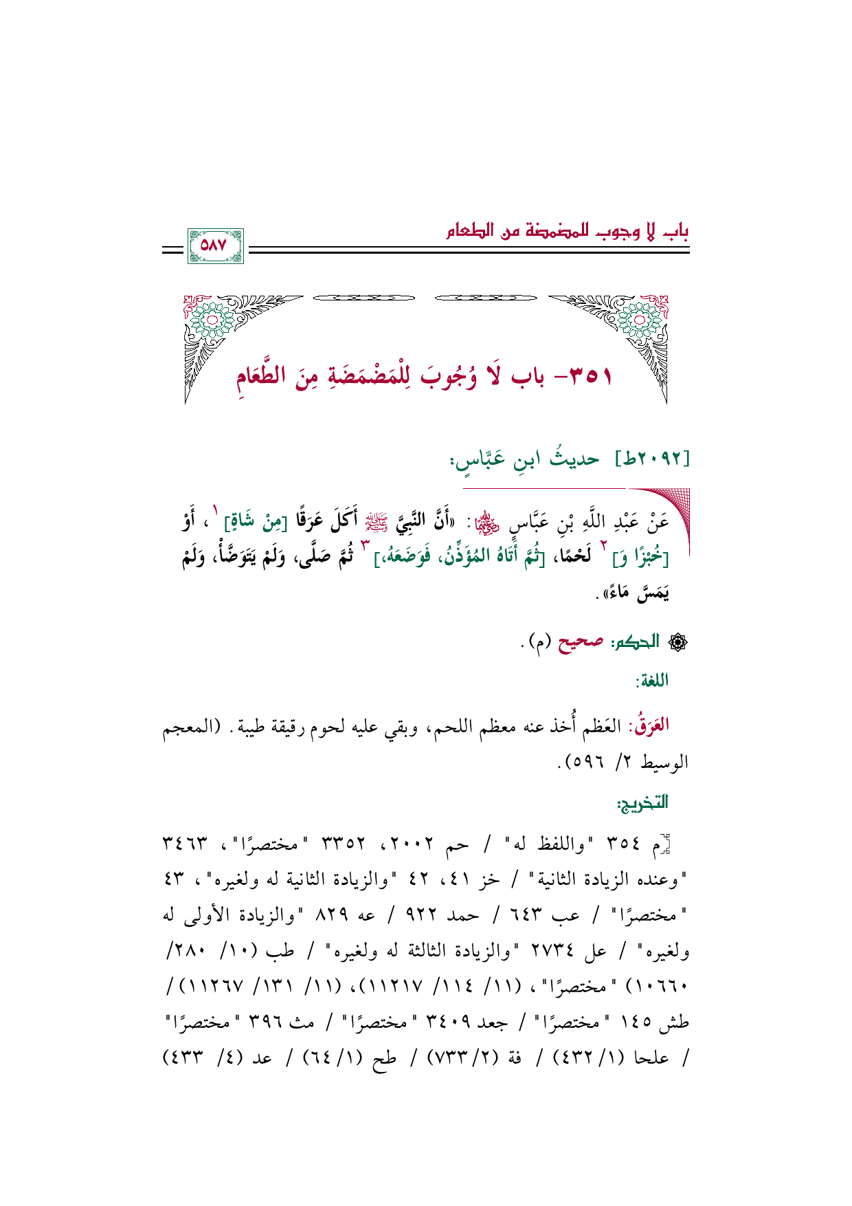 ◼ عَنْ عَبْدِ اللَّهِ بْنِ عَبَّاسٍ رَضِيَ اللهُ عَنْهُمَا: ((أَنَّ النَّبِيَّ صَلَّى اللهُ عَلَيْهِ وَسَلَّمَ أَكَلَ عَرَقًا [مِنْ شَاةٍ] ١، أَوْ [خُبْزًا وَ] ٢ لَحْمًا، [ثُمَّ أَتَاهُ المُؤَذِّنُ، فَوَضَعَهُ، ] ٣ ثُمَّ صَلَّى، وَلَمْ يَتَوَضَّأْ، وَلَمْ يَمَسَّ مَاءً)).