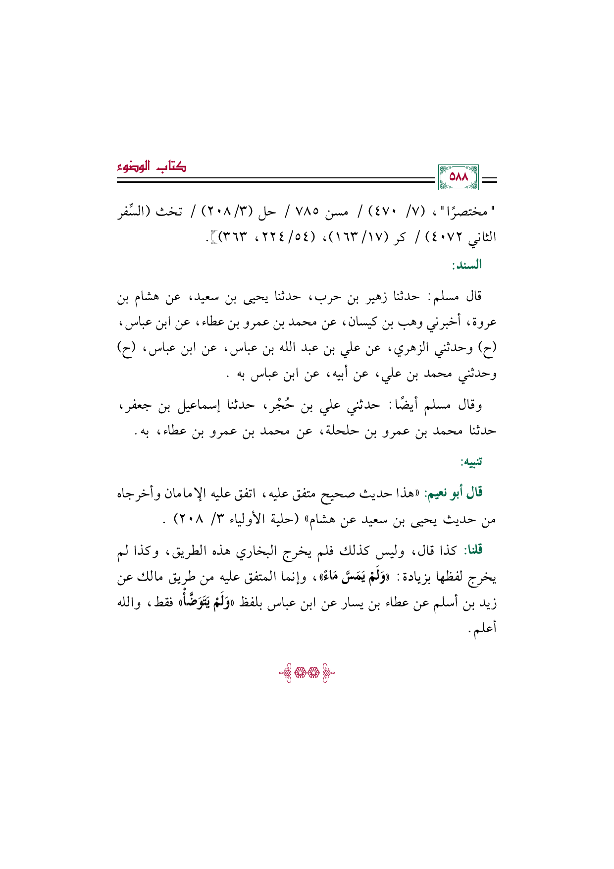 قلنا: كذا قال، وليس كذلك فلم يخرج البخاري هذه الطريق، وكذا لم يخرج لفظها بزيادة: ((وَلَمْ يَمَسَّ مَاءً))، وإنما المتفق عليه من طريق مالك عن زيد بن أسلم عن عطاء بن يسار عن ابن عباس بلفظ ((وَلَمْ يَتَوَضَّأْ)) فقط، والله أعلم.