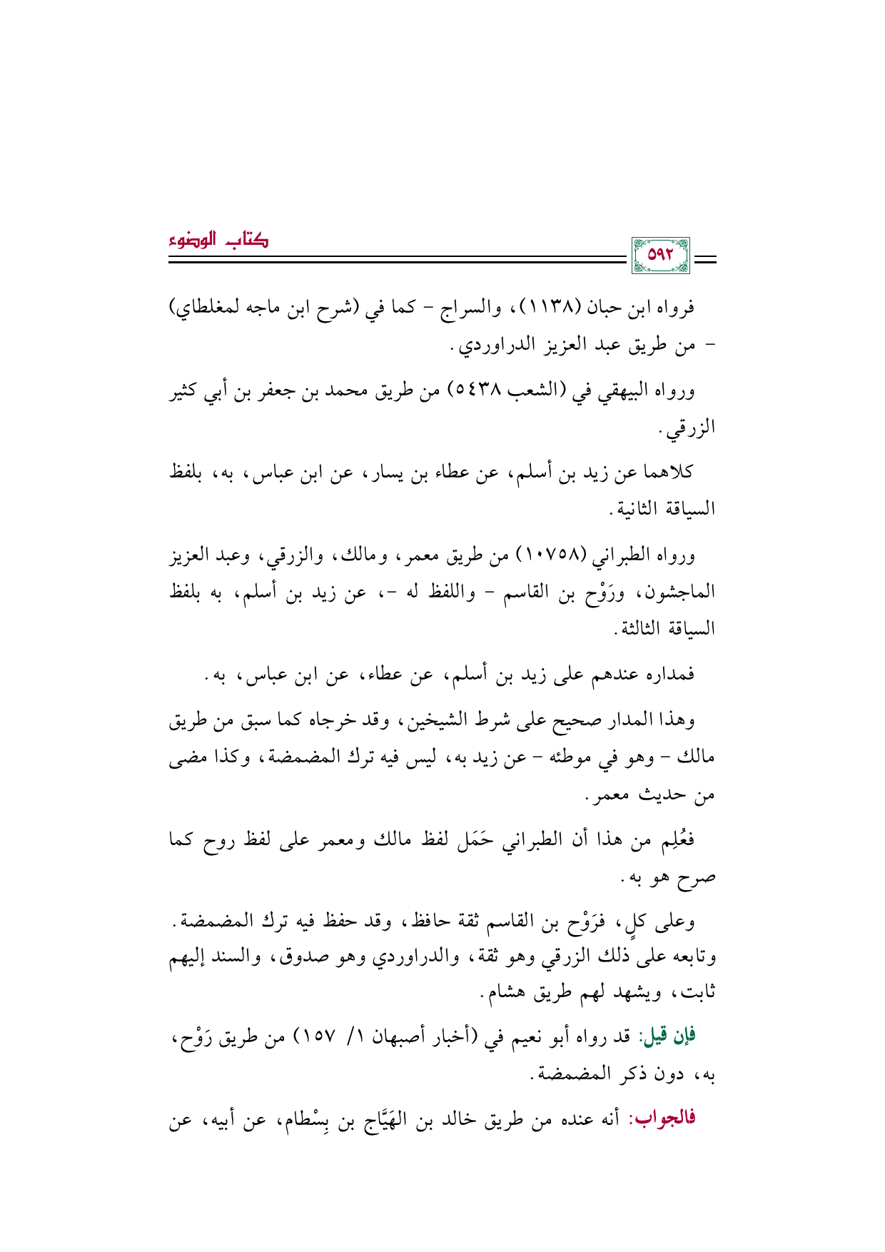 ورواه الطبراني (١٠٧٥٨) من طريق معمر، ومالك، والزرقي، وعبد العزيز الماجشون، ورَوْح بن القاسم - واللفظ له -، عن زيد بن أسلم، به بلفظ السياقة الثالثة.