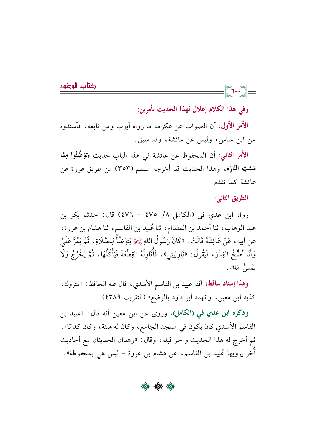 رواه ابن عدي في (الكامل ٨/ ٤٧٥ - ٤٧٦) قال: حدثنا بكر بن عبد الوهاب، ثنا أحمد بن المقدام، ثنا عُبيد بن القاسم، ثنا هشام بن عروة، عن أبيه، عَنْ عَائِشَةَ قَالَتْ: ((كَانَ رَسُولُ اللهِ صَلَّى اللهُ عَلَيْهِ وَسَلَّمَ يَتَوَضَّأُ لِلصَّلَاةِ، ثُمَّ يَمُرُّ عَلَيَّ وَأَنَا أَطْبُخُ القِدْرَ، فَيَقُولُ: «نَاوِلِينِي»، فَأُنَاوِلُهُ القِطْعَةَ فَيَأْكُلُهَا، ثُمَّ يَخْرُجُ وَلَا يَمَسُّ مَاءً)).
