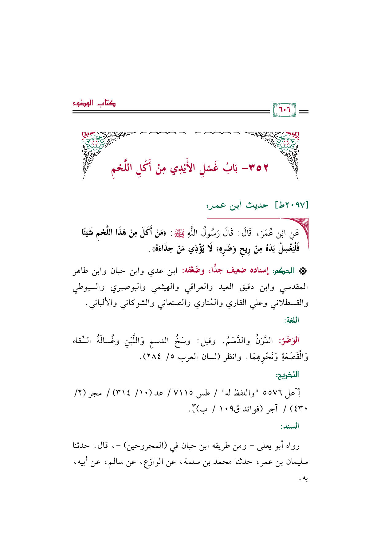 ◼ عَنِ ابْن عُمَرَ، قَالَ: قَالَ رَسُولُ اللَّهِ صَلَّى اللهُ عَلَيْهِ وَسَلَّمَ: «مَنْ أَكَلَ مِنْ هَذَا اللَّحْمِ شَيْئًا فَلْيَغْسِلْ يَدَهُ مِنْ رِيحِ وَضَرِهِ؛ لَا يُؤْذِي مَنْ حِذَاءَهُ».