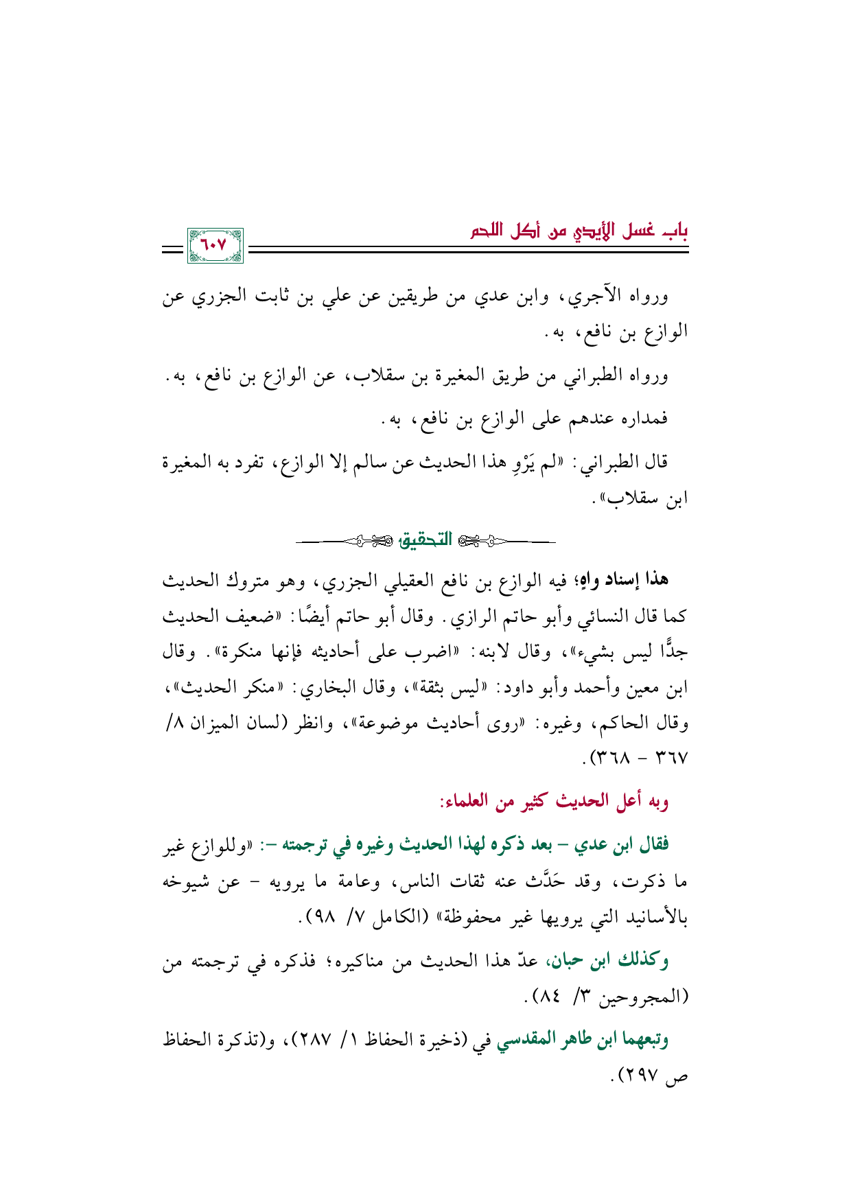 ورواه الآجري، وابن عدي من طريقين عن علي بن ثابت الجزري عن الوازع بن نافع، به.