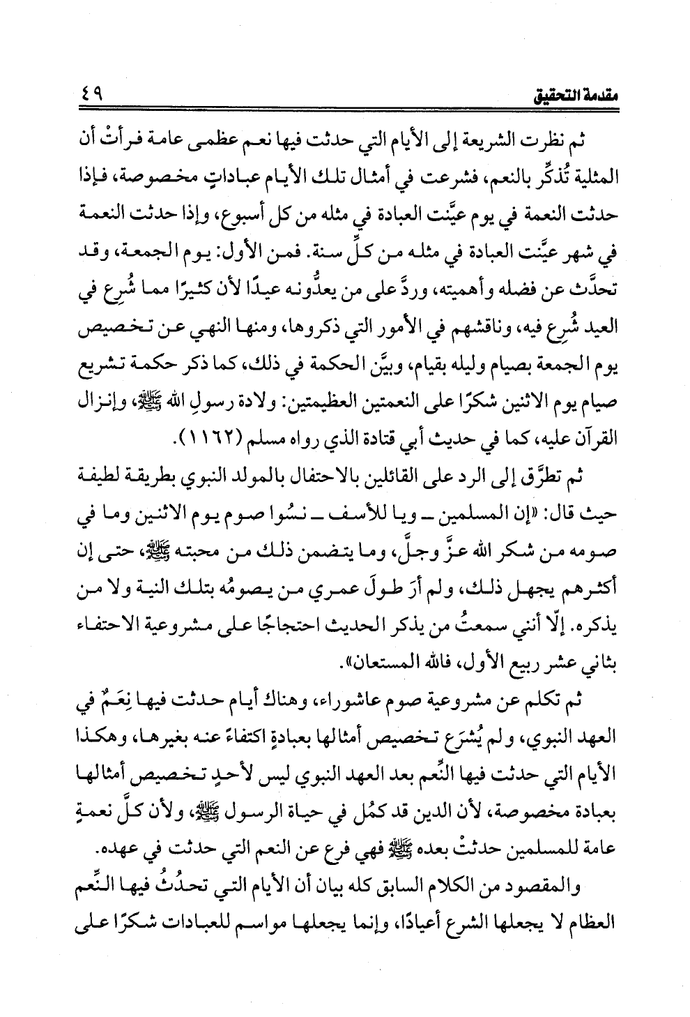 ثم تطرَّق إلى الرد على القائلين بالاحتفال بالمولد النبوي بطريقة لطيفة حيث قال: "إن المسلمين ــ ويا للأسف ــ نسُوا صوم يوم الاثنين وما في صومه من شكر الله عزَّ وجلَّ، وما يتضمن ذلك من محبته - صلى الله عليه وسلم -، حتى إن أكثرهم يجهل ذلك، ولم أرَ طولَ عمري من يصومُه بتلك النية ولا من يذكره. إلّا أنني سمعتُ من يذكر الحديث احتجاجًا على مشروعية الاحتفاء بثاني عشر ربيع الأول، فالله المستعان".
