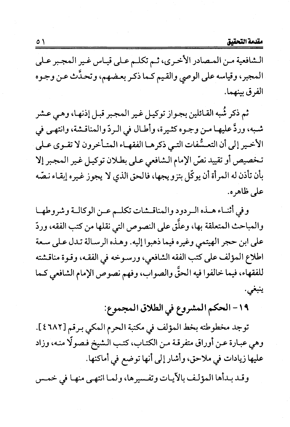 الشافعية من المصادر الأخرى، ثم تكلم على قياس غير المجبر على المجبر، وقياسه على الوصي والقيم كما ذكر بعضهم، وتحدَّث عن وجوه الفرق بينهما.
