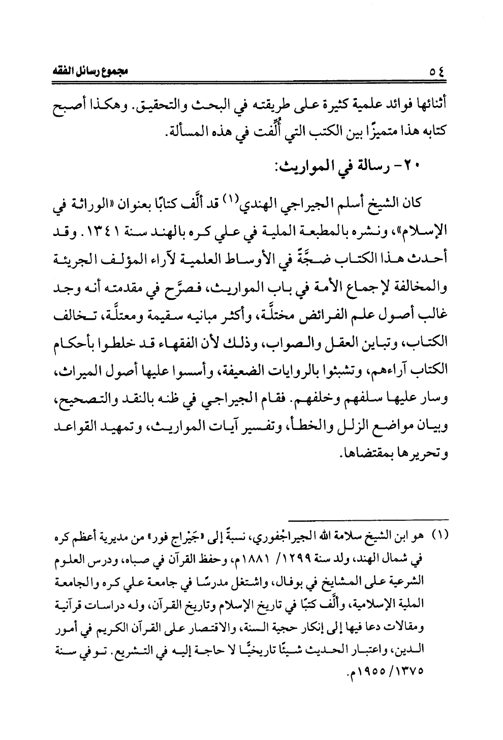 كان الشيخ أسلم الجيراجي الهندي (¬١) قد ألَّف كتابًا بعنوان "الوراثة في الإسلام"، ونشره بالمطبعة الملية في علي كره بالهند سنة ١٣٤١. وقد أحدث هذا الكتاب ضجَّةً في الأوساط العلمية لآراء المؤلف الجريئة والمخالفة لإجماع الأمة في باب المواريث، فصرَّح في مقدمته أنه وجد غالب أصول علم الفرائض مختلَّة، وأكثر مبانيه سقيمة ومعتلَّة، تخالف الكتاب، وتباين العقل والصواب، وذلك لأن الفقهاء قد خلطوا بأحكام الكتاب آراءهم، وتشبثوا بالروايات الضعيفة، وأسسوا عليها أصول الميراث، وسار عليها سلفهم وخلفهم. فقام الجيراجي في ظنه بالنقد والتصحيح، وبيان مواضع الزلل والخطأ، وتفسير آيات المواريث، وتمهيد القواعد وتحريرها بمقتضاها.