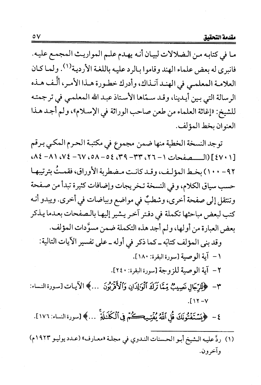 ما في كتابه من الضلالات لبيان أنه يهدم علم المواريث المجمع عليه. فانبرى له بعض علماء الهند وقاموا بالرد عليه باللغة الأردية (¬١). ولما كان العلامة المعلمي في الهند آنذاك، وأدرك خطورة هذا الأمر، ألَّف هذه الرسالة التي بين أيدينا، وقد سمّاها الأستاذ عبد الله المعلمي في ترجمته للشيخ: "إغاثة العلماء من طعن صاحب الوراثة في الإسلام"، ولم أجد هذا العنوان بخط المؤلف.