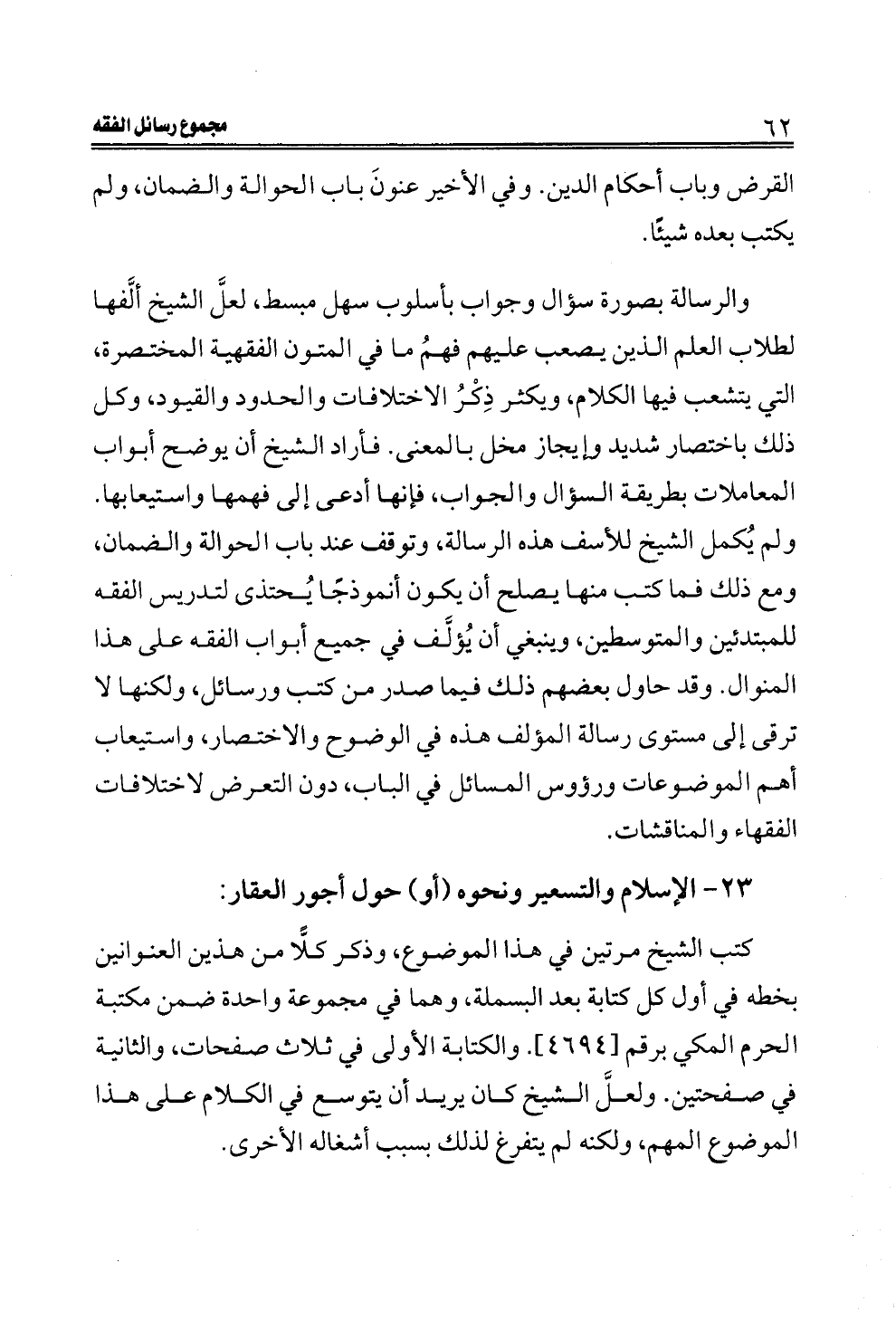 والرسالة بصورة سؤال وجواب بأسلوب سهل مبسط، لعلَّ الشيخ ألَّفها لطلاب العلم الذين يصعب عليهم فهمُ ما في المتون الفقهية المختصرة، التي يتشعب فيها الكلام، ويكثر ذِكْرُ الاختلافات والحدود والقيود، وكل ذلك باختصار شديد وإيجاز مخل بالمعنى. فأراد الشيخ أن يوضح أبواب المعاملات بطريقة السؤال والجواب، فإنها أدعى إلى فهمها واستيعابها. ولم يُكمل الشيخ للأسف هذه الرسالة، وتوقف عند باب الحوالة والضمان، ومع ذلك فما كتب منها يصلح أن يكون أنموذجًا يُحتذى لتدريس الفقه للمبتدئين والمتوسطين، وينبغي أن يُؤلَّف في جميع أبواب الفقه على هذا المنوال. وقد حاول بعضهم ذلك فيما صدر من كتب ورسائل، ولكنها لا ترقى إلى مستوى رسالة المؤلف هذه في الوضوح والاختصار، واستيعاب أهم الموضوعات ورؤوس المسائل في الباب، دون التعرض لاختلافات الفقهاء والمناقشات.