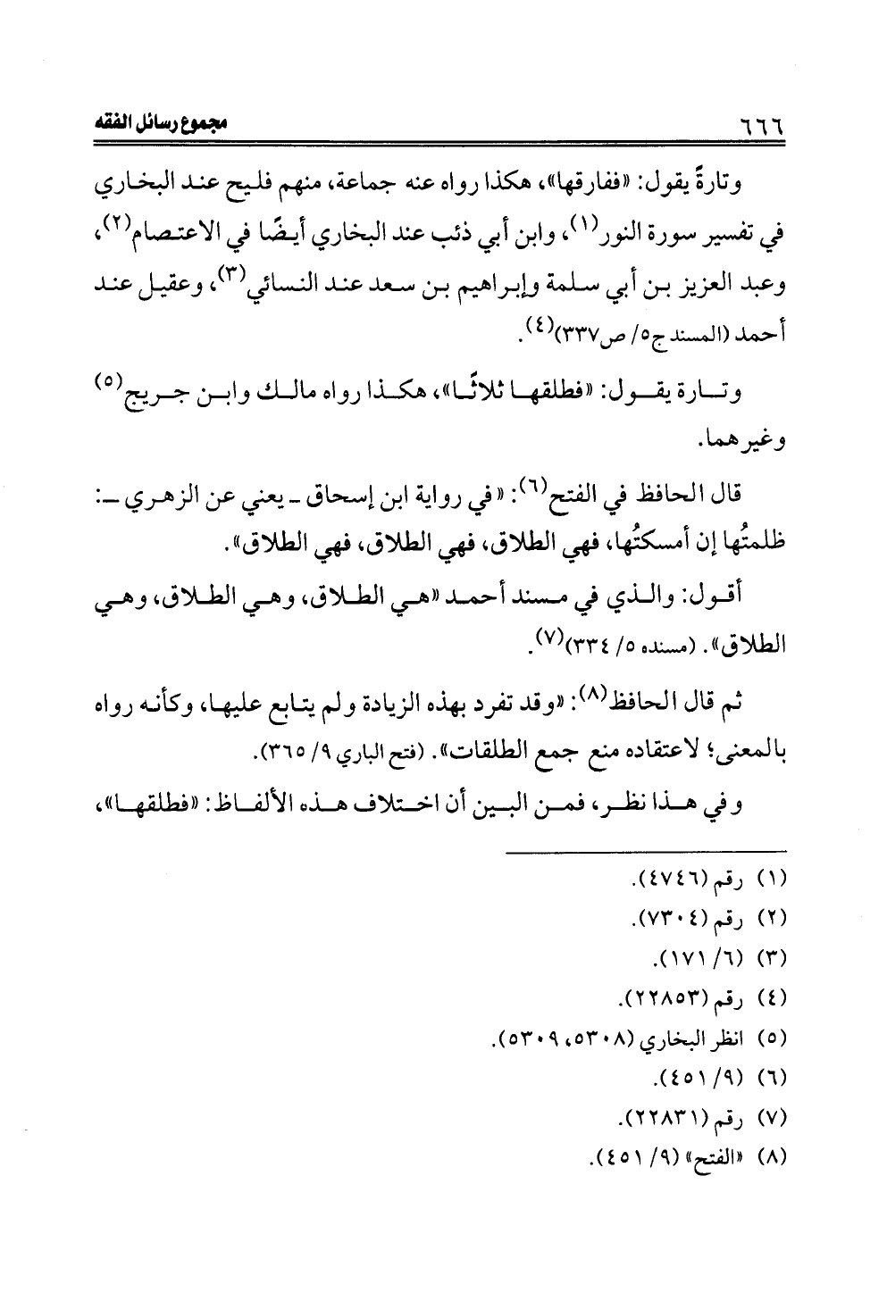 وتارةً يقول: "ففارقها"، هكذا رواه عنه جماعة، منهم فليح عند البخاري في تفسير سورة النور (¬١)، وابن أبي ذئب عند البخاري أيضًا في الاعتصام (¬٢)، وعبد العزيز بن أبي سلمة وإبراهيم بن سعد عند النسائي (¬٣)، وعقيل عند أحمد (المسند ج ٥/ص ٣٣٧) (¬٤).