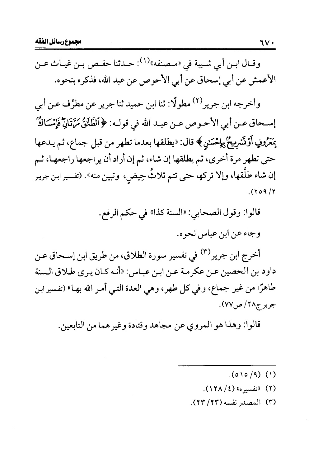 وأخرجه ابن جرير (¬٢) مطولًا: ثنا ابن حميد ثنا جرير عن مطرِّف عن أبي إسحاق عن أبي الأحوص عن عبد الله في قوله: {الطَّلَاقُ مَرَّتَانِ فَإِمْسَاكٌ بِمَعْرُوفٍ أَوْ تَسْرِيحٌ بِإِحْسَانٍ} قال: "يطلقها بعدما تطهر من قبل جماع، ثم يدعها حتى تطهر مرة أخرى، ثم يطلقها إن شاء، ثم إن أراد أن يراجعها راجعها، ثم إن شاء طلَّقها، وإلا تركها حتى تتم ثلاثُ حِيضٍ، وتبين منه". (تفسير ابن جرير ٢/ ٢٥٩).