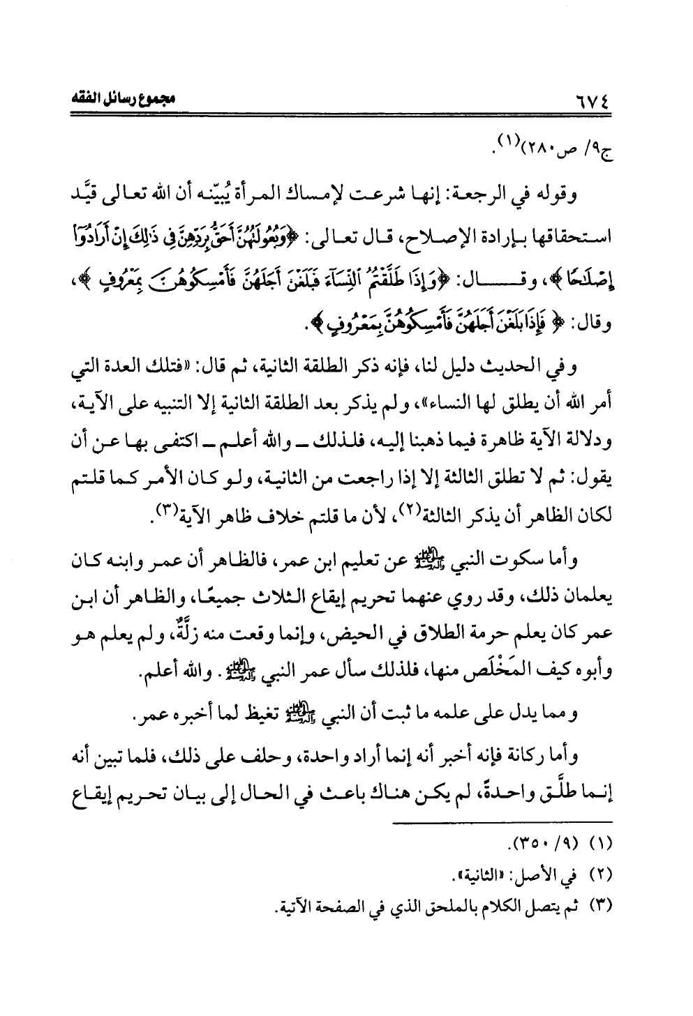 وقوله في الرجعة: إنها شرعت لإمساك المرأة يُبيّنه أن الله تعالى قيَّد استحقاقها بإرادة الإصلاح، قال تعالى: {وَبُعُولَتُهُنَّ أَحَقُّ بِرَدِّهِنَّ فِي ذَلِكَ إِنْ أَرَادُوا إِصْلَاحًا}، وقال: {وَإِذَا طَلَّقْتُمُ النِّسَاءَ فَبَلَغْنَ أَجَلَهُنَّ فَأَمْسِكُوهُنَّ بِمَعْرُوفٍ}، وقال: {فَإِذَا بَلَغْنَ أَجَلَهُنَّ فَأَمْسِكُوهُنَّ بِمَعْرُوفٍ}.