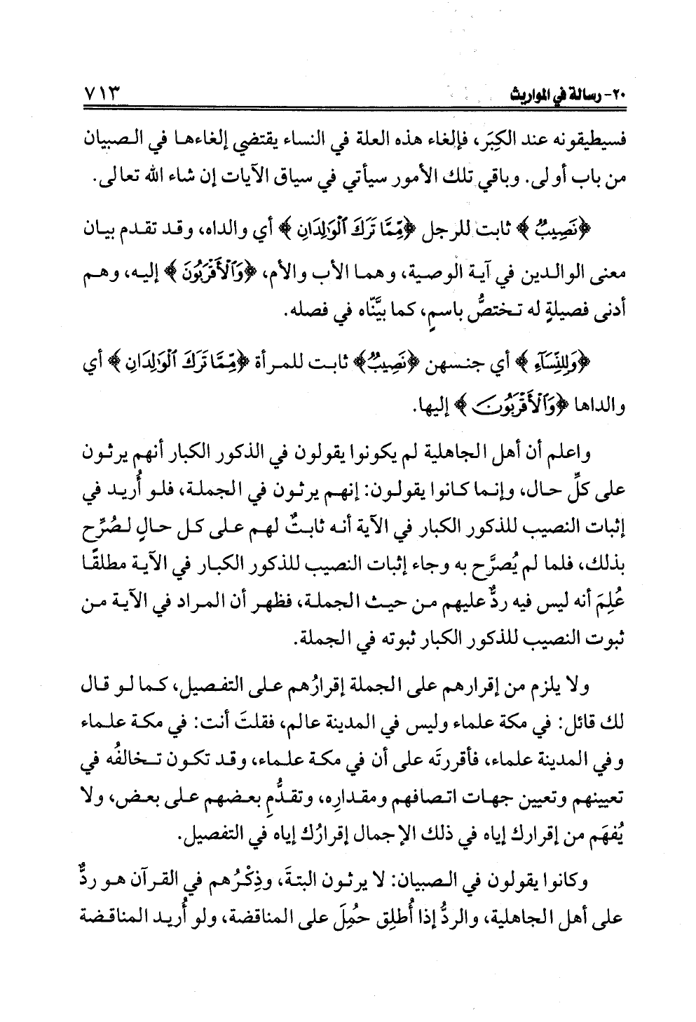 واعلم أن أهل الجاهلية لم يكونوا يقولون في الذكور الكبار أنهم يرثون على كلِّ حال، وإنما كانوا يقولون: إنهم يرثون في الجملة، فلو أُريد في إثبات النصيب للذكور الكبار في الآية أنه ثابتٌ لهم على كل حالٍ لصُرِّح بذلك، فلما لم يُصرَّح به وجاء إثبات النصيب للذكور الكبار في الآية مطلقًا عُلِمَ أنه ليس فيه ردٌّ عليهم من حيث الجملة، فظهر أن المراد في الآية من ثبوت النصيب للذكور الكبار ثبوته في الجملة.