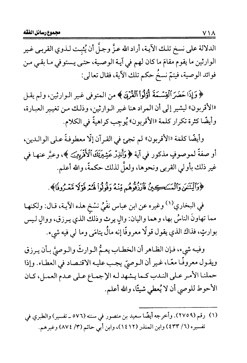في البخاري (¬١) وغيره عن ابن عباس نفْيُ نسْخِ هذه الآية، قال: ولكنها مما تهاونَ الناسُ بها، وهما واليان: والٍ يرث وذلك الذي يرزق، ووالٍ ليس بوارثٍ، فذاك الذي يقول قولًا معروفًا إنه مالُ يتامَى وما لي فيه شيء.