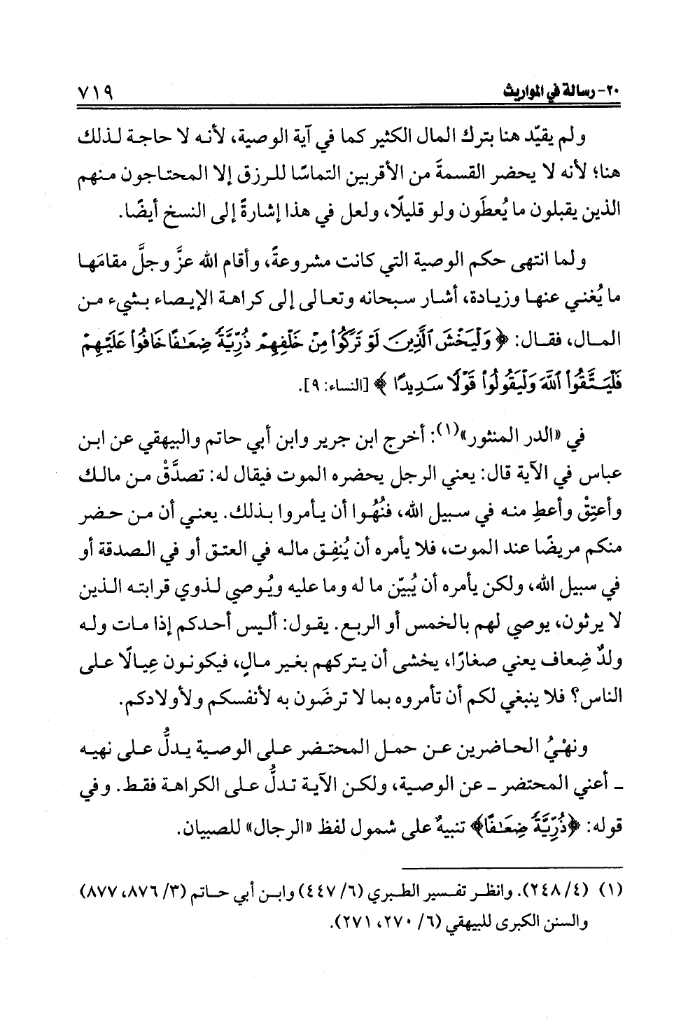 في "الدر المنثور" (¬١): أخرج ابن جرير وابن أبي حاتم والبيهقي عن ابن عباس في الآية قال: يعني الرجل يحضره الموت فيقال له: تصدَّقْ من مالك وأعتِقْ وأعطِ منه في سبيل الله، فنُهُوا أن يأمروا بذلك. يعني أن من حضر منكم مريضًا عند الموت، فلا يأمره أن يُنفِق ماله في العتق أو في الصدقة أو في سبيل الله، ولكن يأمره أن يُبيّن ما له وما عليه ويُوصي لذوي قرابته الذين لا يرثون، يوصي لهم بالخمس أو الربع. يقول: أليس أحدكم إذا مات وله ولدٌ ضِعاف يعني صغارًا، يخشى أن يتركهم بغير مالٍ، فيكونون عِيالًا على الناس؟ فلا ينبغي لكم أن تأمروه بما لا ترضَون به لأنفسكم ولأولادكم.