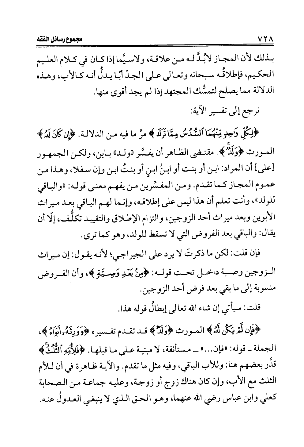 {لِكُلِّ وَاحِدٍ مِنْهُمَا السُّدُسُ مِمَّا تَرَكَ} مرَّ ما فيه من الدلالة. {إِنْ كَانَ لَهُ} المورث {وَلَدٌ}. مقتضى الظاهر أن يفسَّر "ولد" بابن، ولكن الجمهور [على] أن المراد: ابن أو بنت أو ابنُ ابنٍ أو بنتُ ابن وإن سفلا، وهذا من عموم المجاز كما تقدم. ومن المفسِّرين من يفهم معنى قوله: "والباقي للولد"، وأنت تعلم أن هذا ليس على إطلاقه، وإنما لهم الباقي بعد ميراث الأبوين وبعد ميراث أحد الزوجين، والتزام الإطلاق والتقييد تكلُّف، إلّا أن يقال: والباقي بعد الفروض التي لا تسقط للولد، وهو كما ترى.