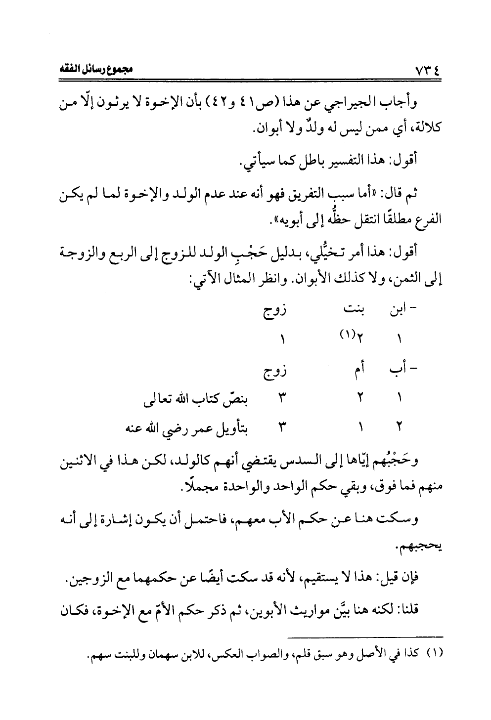 (¬١) كذا في الأصل وهو سبق قلم، والصواب العكس، للابن سهمان وللبنت سهم.