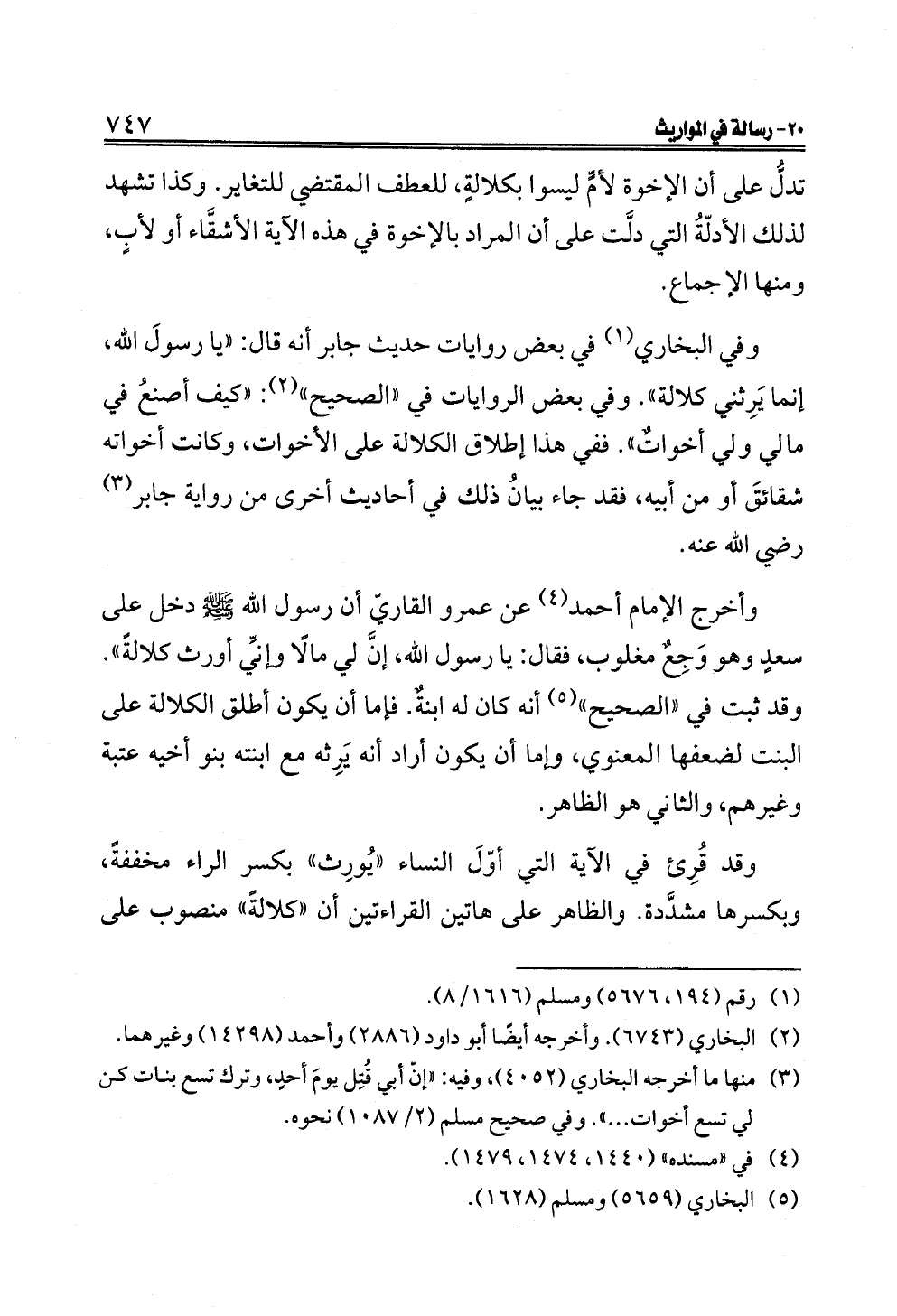 وفي البخاري (¬١) في بعض روايات حديث جابر أنه قال: "يا رسولَ الله، إنما يَرِثني كلالة". وفي بعض الروايات في "الصحيح" (¬٢): "كيف أصنعُ في مالي ولي أخواتٌ". ففي هذا إطلاق الكلالة على الأخوات، وكانت أخواته شقائقَ أو من أبيه، فقد جاء بيانُ ذلك في أحاديث أخرى من رواية جابر (¬٣) رضي الله عنه.