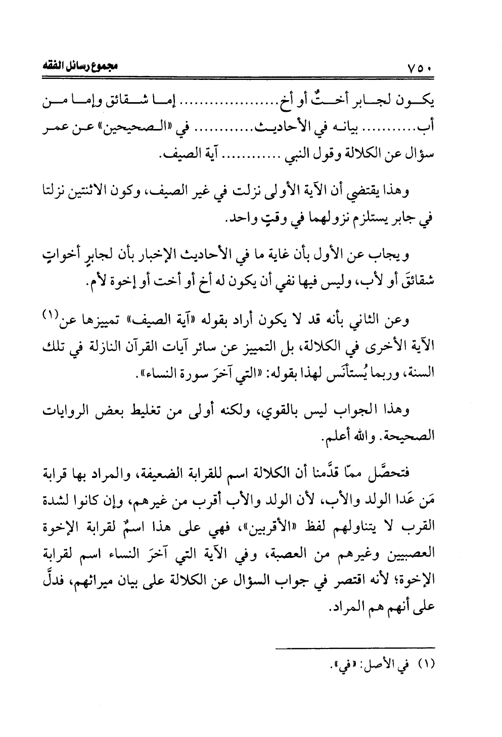يكون لجابر أختٌ أو أخ .................... إما شقائق وإما من أب ........... بيانه في الأحاديث ............ في "الصحيحين" عن عمر سؤال عن الكلالة وقول النبي ............ آية الصيف.
