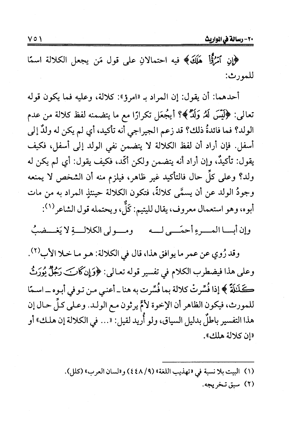 أحدهما: أن يقول: إن المراد بـ "امرؤ": كلالة، وعليه فما يكون قوله تعالى: {لَيْسَ لَهُ وَلَدٌ}؟ أيُجعَل تكرارًا مع ما يتضمنه لفظ كلالة من عدم الولد؟ فما فائدةُ ذلك؟ قد زعم الجيراجي أنه تأكيد، أي لم يكن له ولدٌ إلى أسفل. فإن أراد أن لفظ الكلالة لا يتضمن نفي الولد إلى أسفل، فكيف يقول: تأكيدٌ، وإن أراد أنه يتضمن ولكن أكّد، فكيف يقول: أي لم يكن له ولد؟ وعلى كلِّ حال فالتأكيد غير ظاهر، فيلزم منه أن الشخص لا يمنعه وجودُ الولد عن أن يسمَّى كلالةً، فتكون الكلالة حينئذٍ المراد به من مات أبوه، وهو استعمال معروف، يقال لليتيم: كَلٌّ، ويحتمله قول الشاعر (¬١):