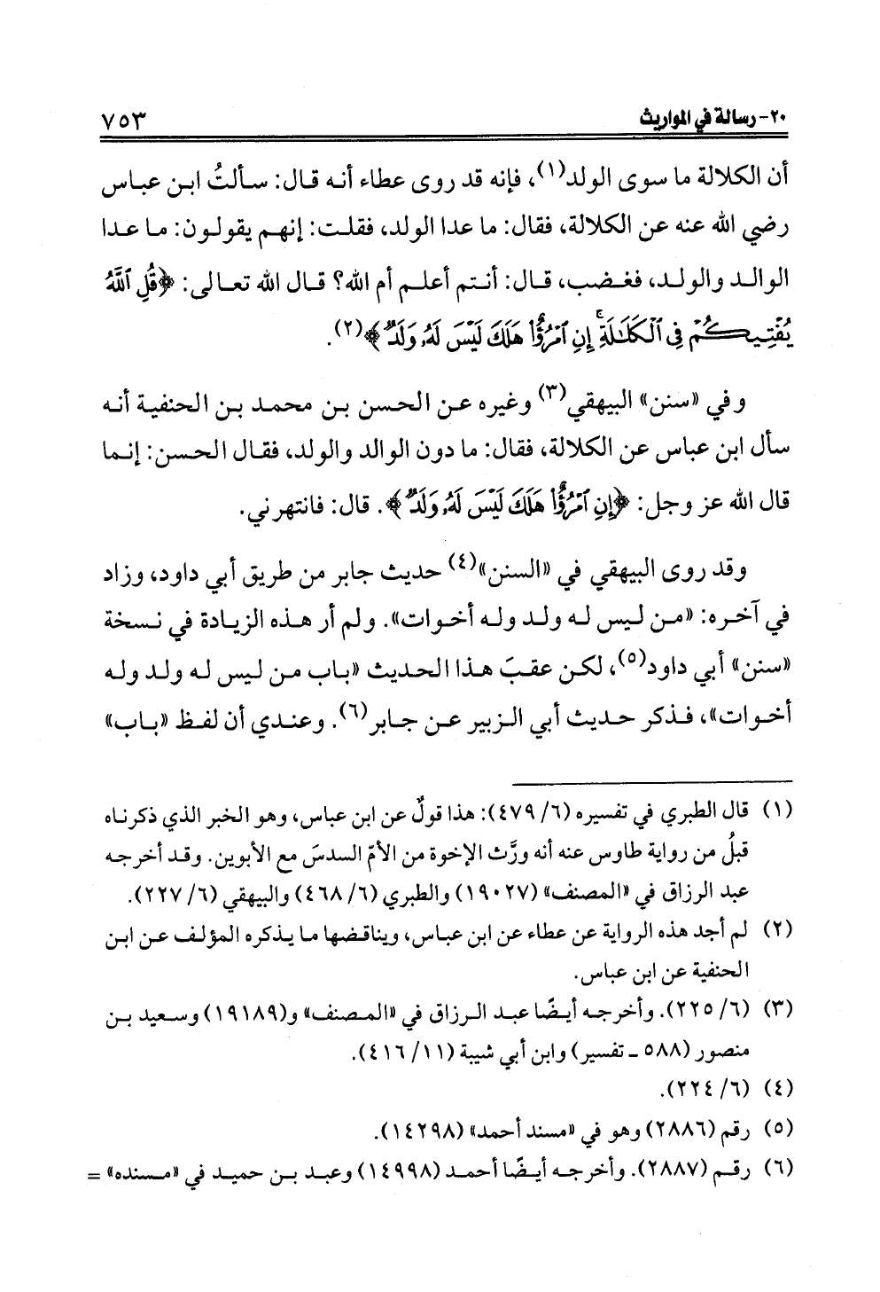 وفي "سنن" البيهقي (¬٣) وغيره عن الحسن بن محمد بن الحنفية أنه سأل ابن عباس عن الكلالة، فقال: ما دون الوالد والولد، فقال الحسن: إنما قال الله عز وجل: {إِنِ امْرُؤٌ هَلَكَ لَيْسَ لَهُ وَلَدٌ}. قال: فانتهرني.