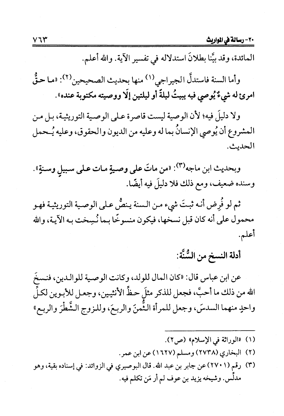 وبحديث ابن ماجه (¬٣): "من ماتَ على وصيةٍ مات على سبيلٍ وسنةٍ". وسنده ضعيف، ومع ذلك فلا دليلَ فيه أيضًا.