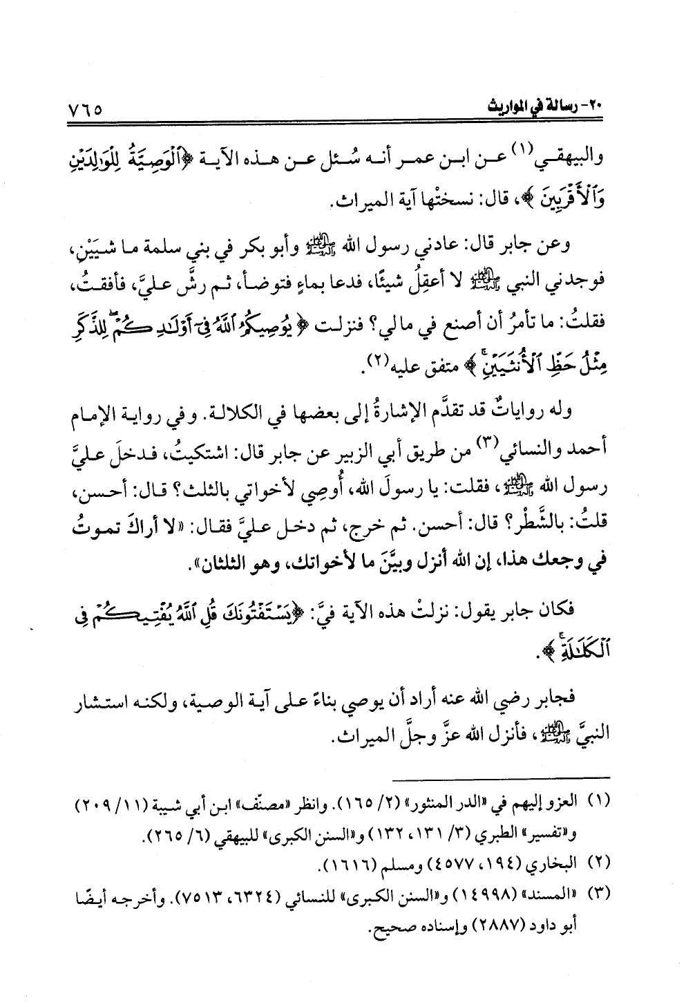 وعن جابر قال: عادني رسول الله - صلى الله عليه وآله وسلم - وأبو بكر في بني سلمة ما شيَيْنِ، فوجدني النبي - صلى الله عليه وآله وسلم - لا أعقِلُ شيئًا، فدعا بماءٍ فتوضأ، ثم رشَّ عليَّ، فأفقتُ، فقلتُ: ما تأمرُ أن أصنع في مالي؟ فنزلت {يُوصِيكُمُ اللَّهُ فِي أَوْلَادِكُمْ لِلذَّكَرِ مِثْلُ حَظِّ الْأُنْثَيَيْنِ} متفق عليه (¬٢).