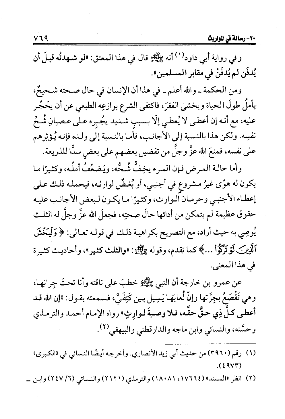 عن عمرو بن خارجة أن النبي - صلى الله عليه وآله وسلم - خطبَ على ناقته وأنا تحتَ جِرانِها، وهي تَقْصَعُ بجِرَّتها وإنّ لُعابَها يَسِيل بين كَتِفَيَّ، فسمعته يقول: "إن الله قد أعطى كلَّ ذِي حقٍّ حقَّه، فلا وصيةَ لوارِثٍ" رواه الإمام أحمد والترمذي وحسَّنه، والنسائي وابن ماجه والدارقطني والبيهقي (¬٢).