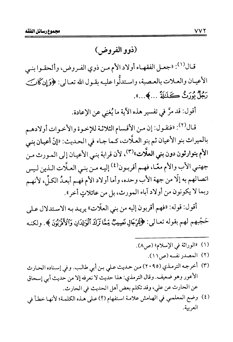 قال (¬٢): "فنقول: إن من الأقسام الثلاثة للإخوة والأخوات أولادهم بالميراث بنو الأعيان ثم بنو العلَّات، كما جاء في الحديث: "إنّ أعيان بني الأم يتوارثون دون بني العلَّات" (¬٣)، لأن قرابة بني الأعيان إلى المورث من جهتي الأب والأم معًا، فهم أقربون (¬٤) إليه من بني العلَّات الذين ليس اتصالهم به إلّا من جهة الأب وحده، وأما أولاد الأم فهم أبعدُ الكلِّ، لأنهم ربما لا يكونون من أولاد آباء المورث، بل من عائلاتٍ أخر".