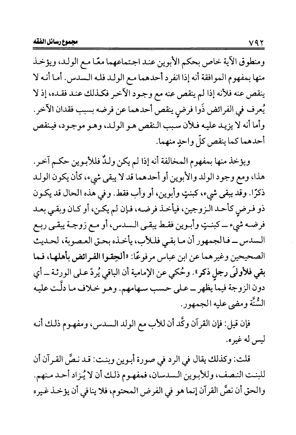 قلت: وكذلك يقال في الرد في صورة أبوين وبنت: قد نصَّ القرآن أن للبنت النصف، وللأبوين السدسان، فمفهوم ذلك أن لا يُزاد أحد منهم. والحق أن نصَّ القرآن إنما هو في الفرض المحتوم، فلا ينافي أن يؤخذ غيره