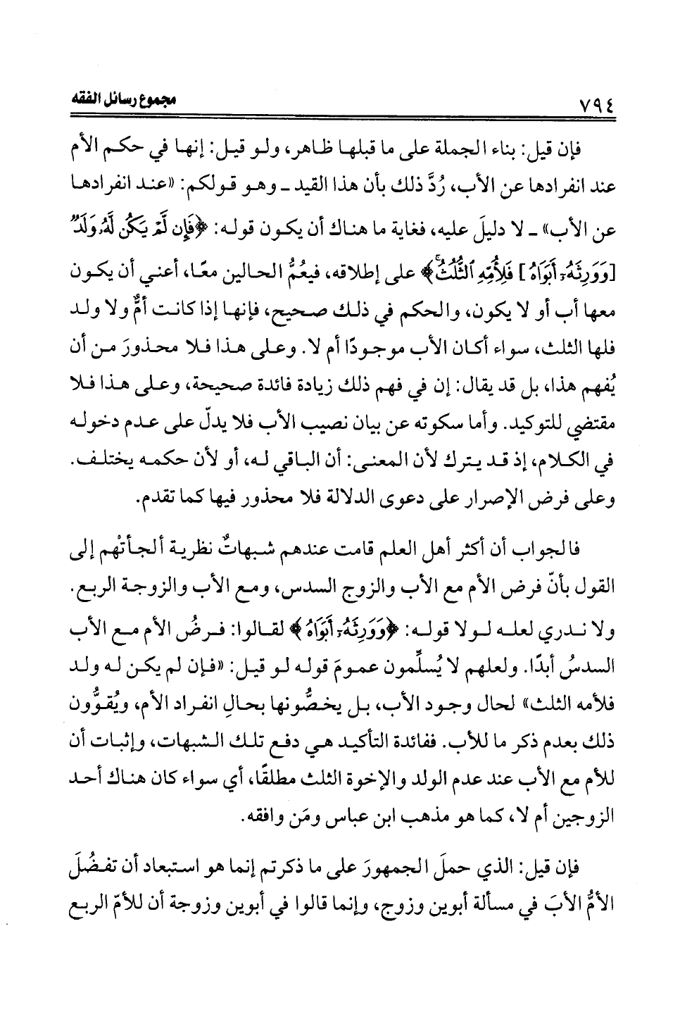 فإن قيل: الذي حملَ الجمهورَ على ما ذكرتم إنما هو استبعاد أن تفضُلَ الأمُّ الأبَ في مسألة أبوين وزوج، وإنما قالوا في أبوين وزوجة أن للأمّ الربع