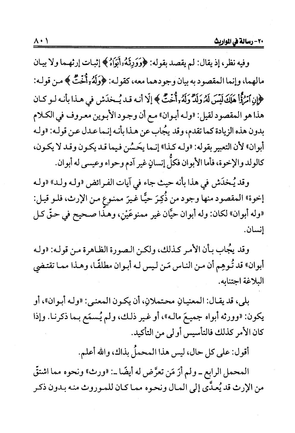 وفيه نظر، إذ يقال: لم يقصد بقوله: {وَوَرِثَهُ أَبَوَاهُ} إثبات إرثهما ولا بيان مالهما، وإنما المقصود به بيان وجودهما معه، كقوله: {وَلَهُ أُخْتٌ} من قوله: {إِنِ امْرُؤٌ هَلَكَ لَيْسَ لَهُ وَلَدٌ وَلَهُ أُخْتٌ} إلّا أنه قد يُخدَش في هذا بأنه لو كان هذا هو المقصود لقيل: "وله أبوان" مع أن وجود الأبوين معروف في الكلام بدون هذه الزيادة كما تقدم، وقد يُجاب عن هذا بأنه إنما عدل عن قوله: "وله أبوان" لأن التعبير بقوله: "وله كذا" إنما يَحسُن فيما قد يكون وقد لا يكون، كالولد والإخوة، فأما الأبوان فكلُّ إنسانٍ غير آدم وحواء وعيسى له أبوان.