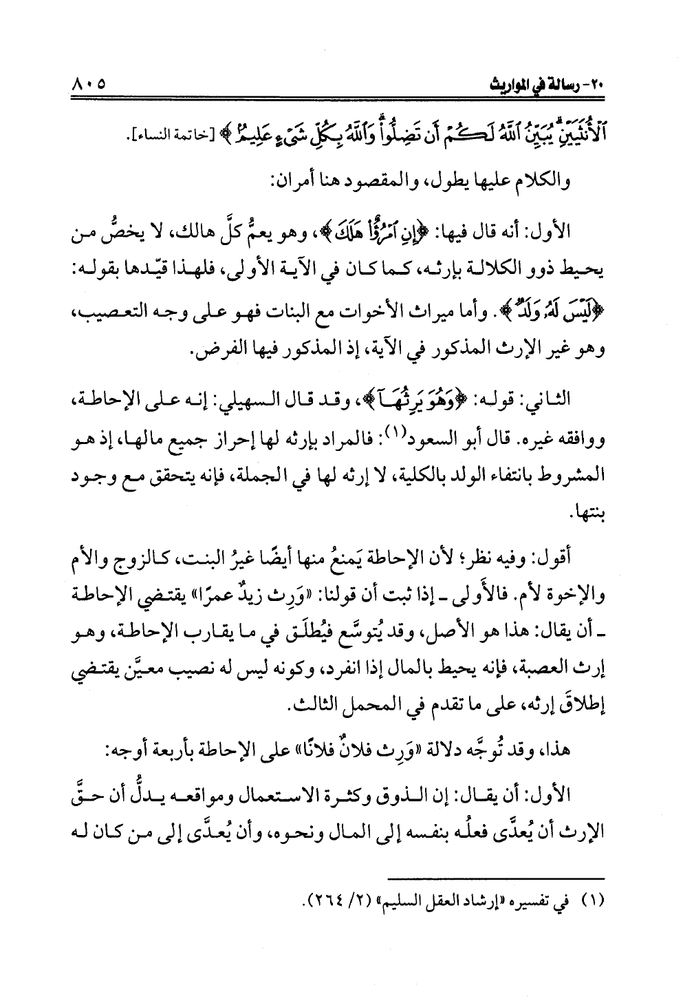أقول: وفيه نظر؛ لأن الإحاطة يَمنعُ منها أيضًا غيرُ البنت، كالزوج والأم والإخوة لأم. فالأَولى ــ إذا ثبت أن قولنا: "وَرِث زيدٌ عمرًا" يقتضي الإحاطة ــ أن يقال: هذا هو الأصل، وقد يُتوسَّع فيُطلَق في ما يقارب الإحاطة، وهو إرث العصبة، فإنه يحيط بالمال إذا انفرد، وكونه ليس له نصيب معيَّن يقتضي إطلاقَ إرثه، على ما تقدم في المحمل الثالث.